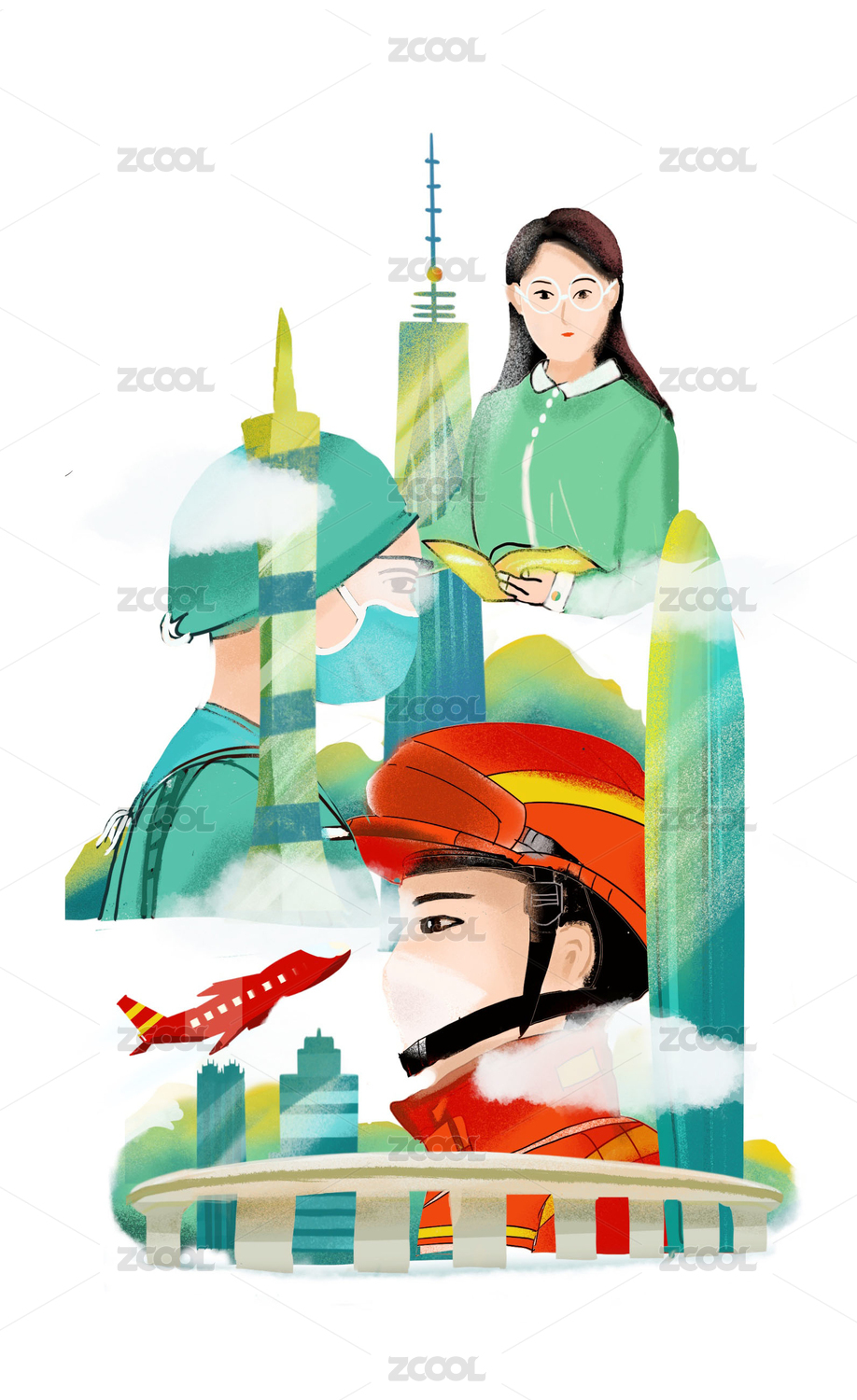 51勞動(dòng)節(jié)消防員護(hù)士城市建筑人物海報(bào)插畫