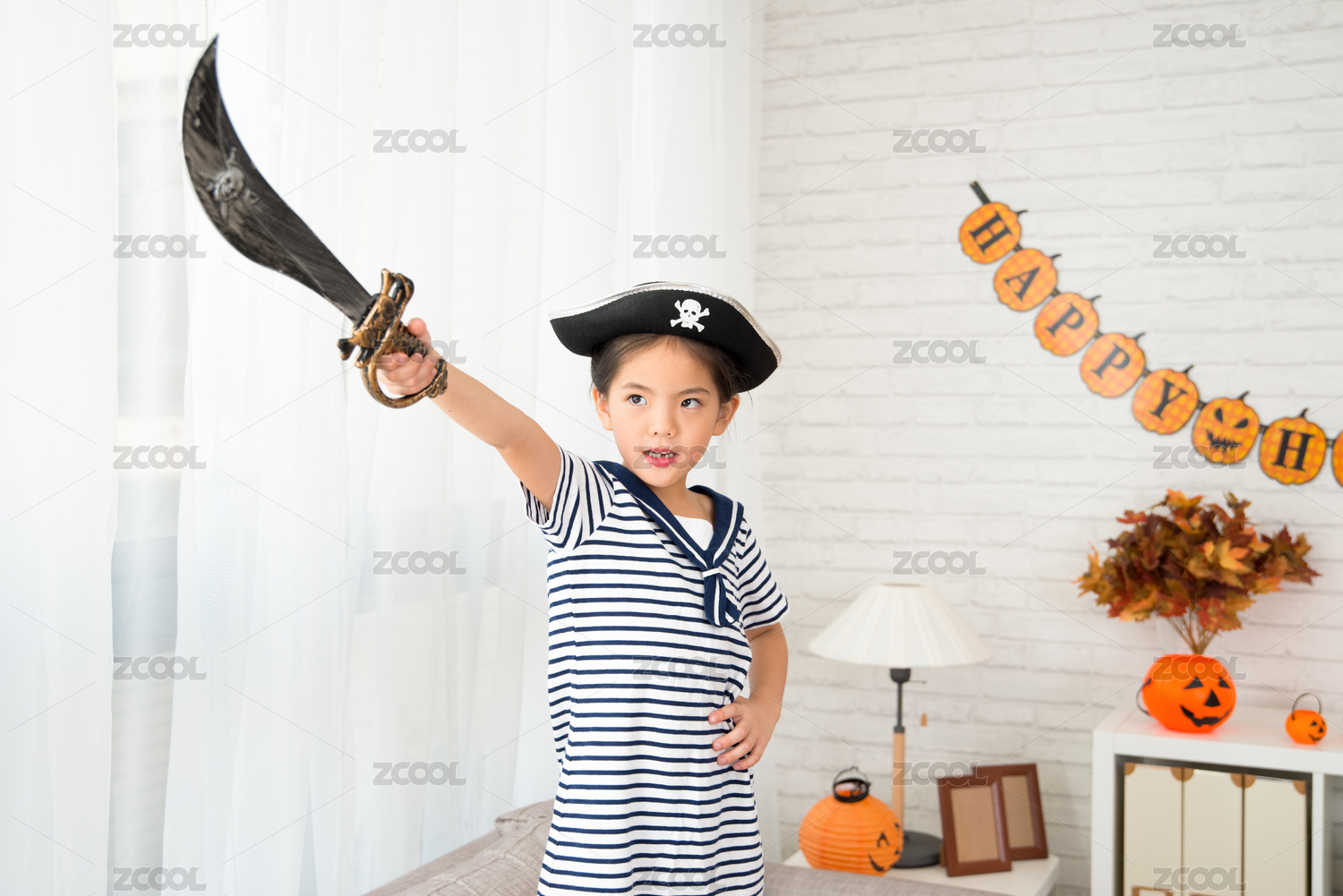 小女孩的海盜持刀宗旨,以她的未來發(fā)展方向的萬圣節(jié)裝扮游戲在家里