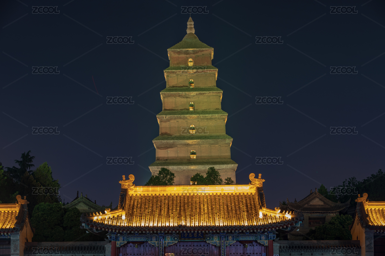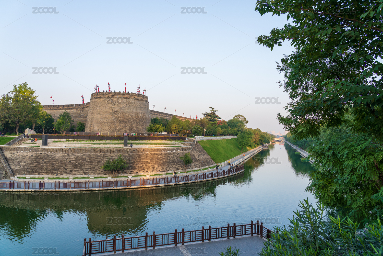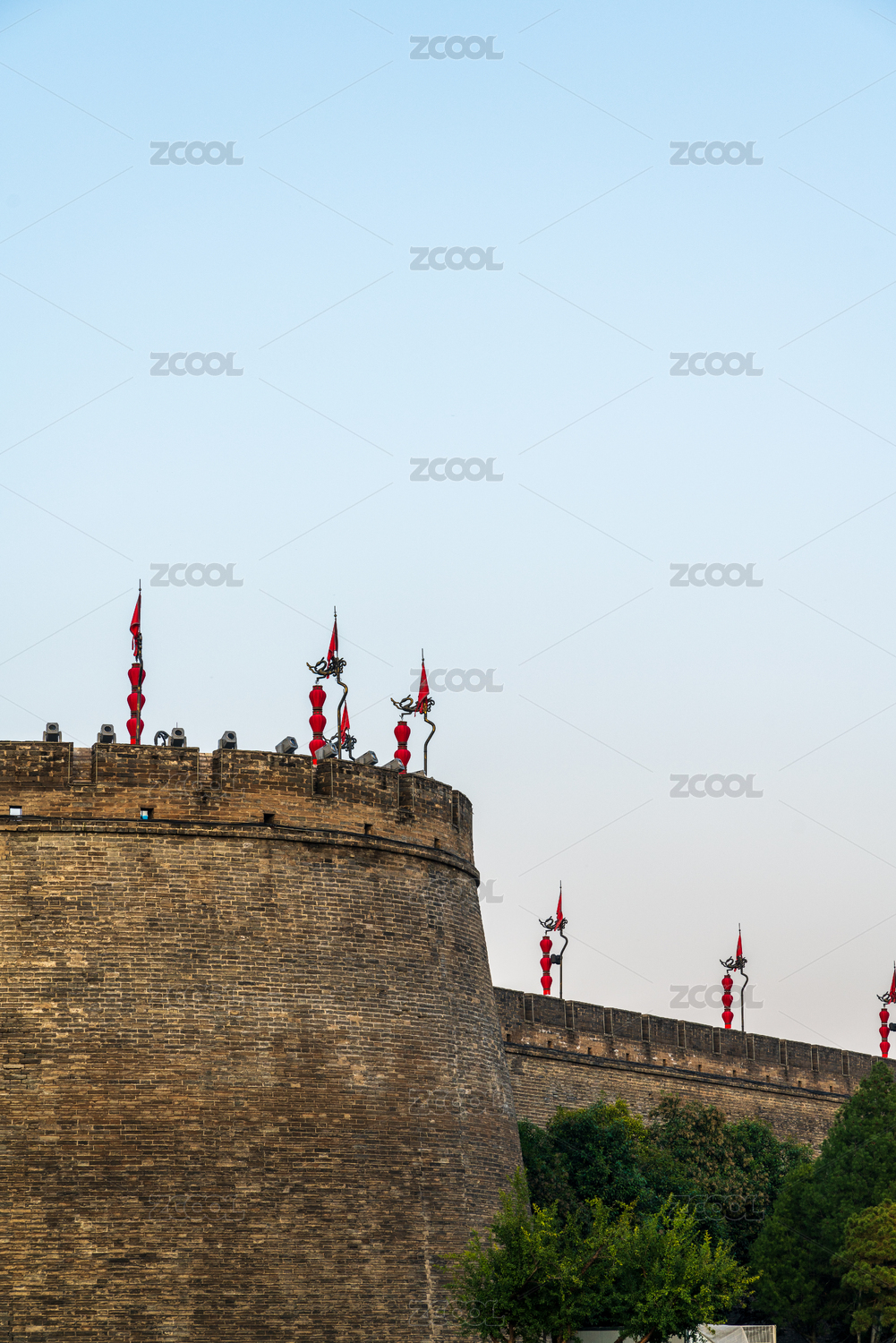 陜西省西安市夜晚月亮光照古城墻角樓建筑