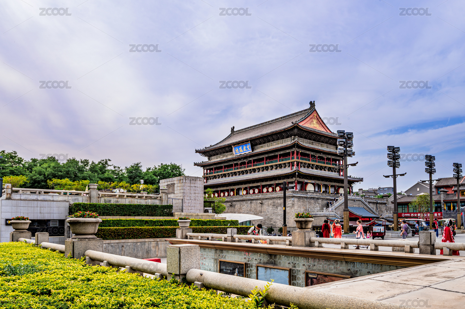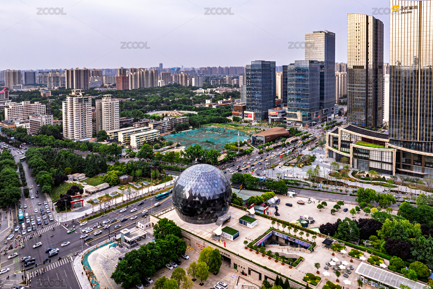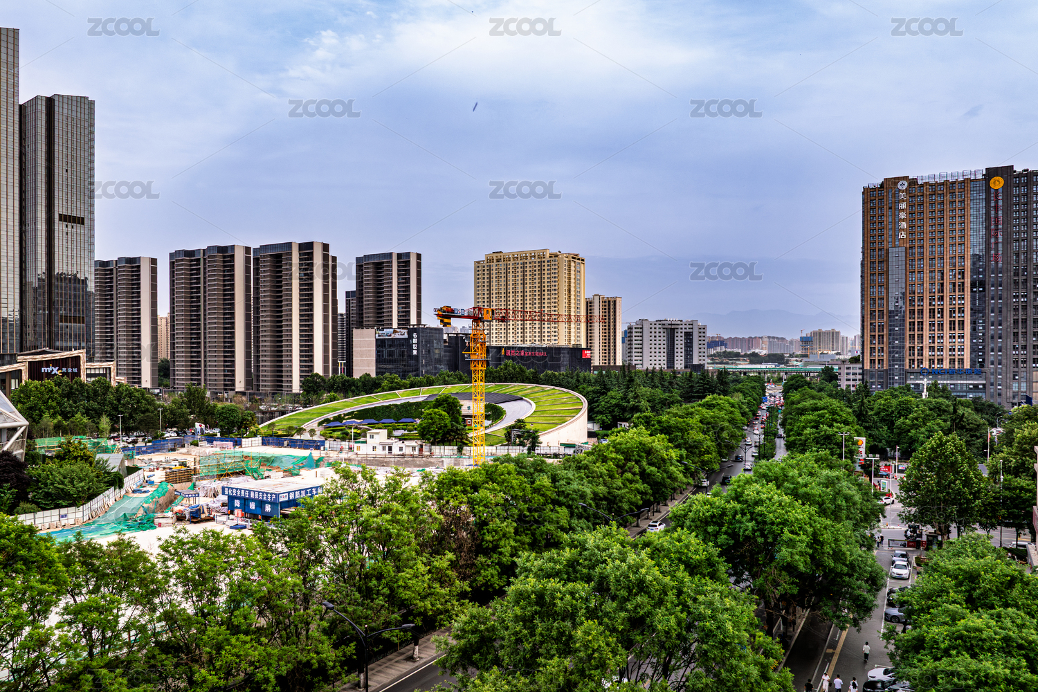 陜西省西安市-藍天映襯下的低角度鳥瞰