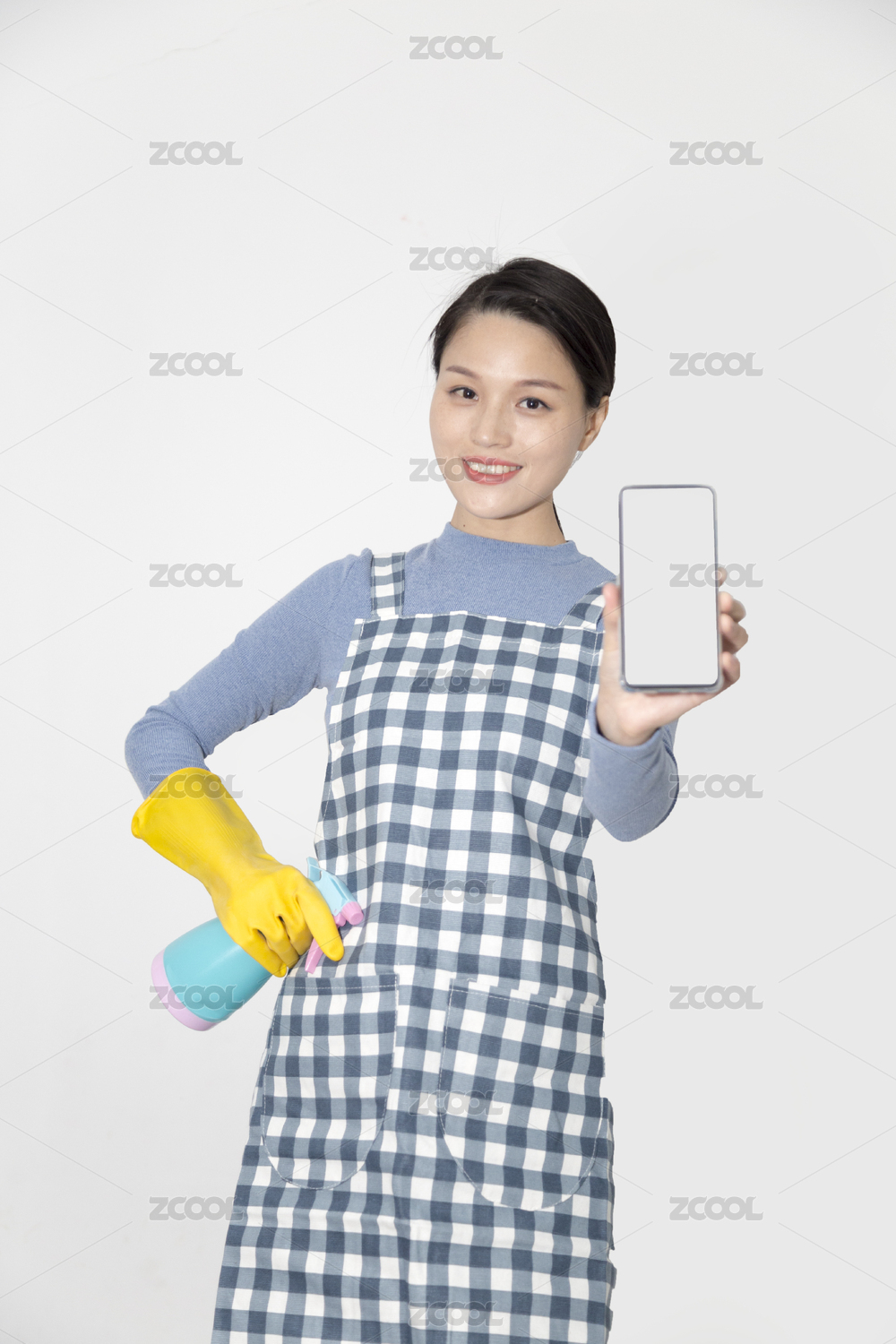 一名展示手機的東方女性清潔保姆