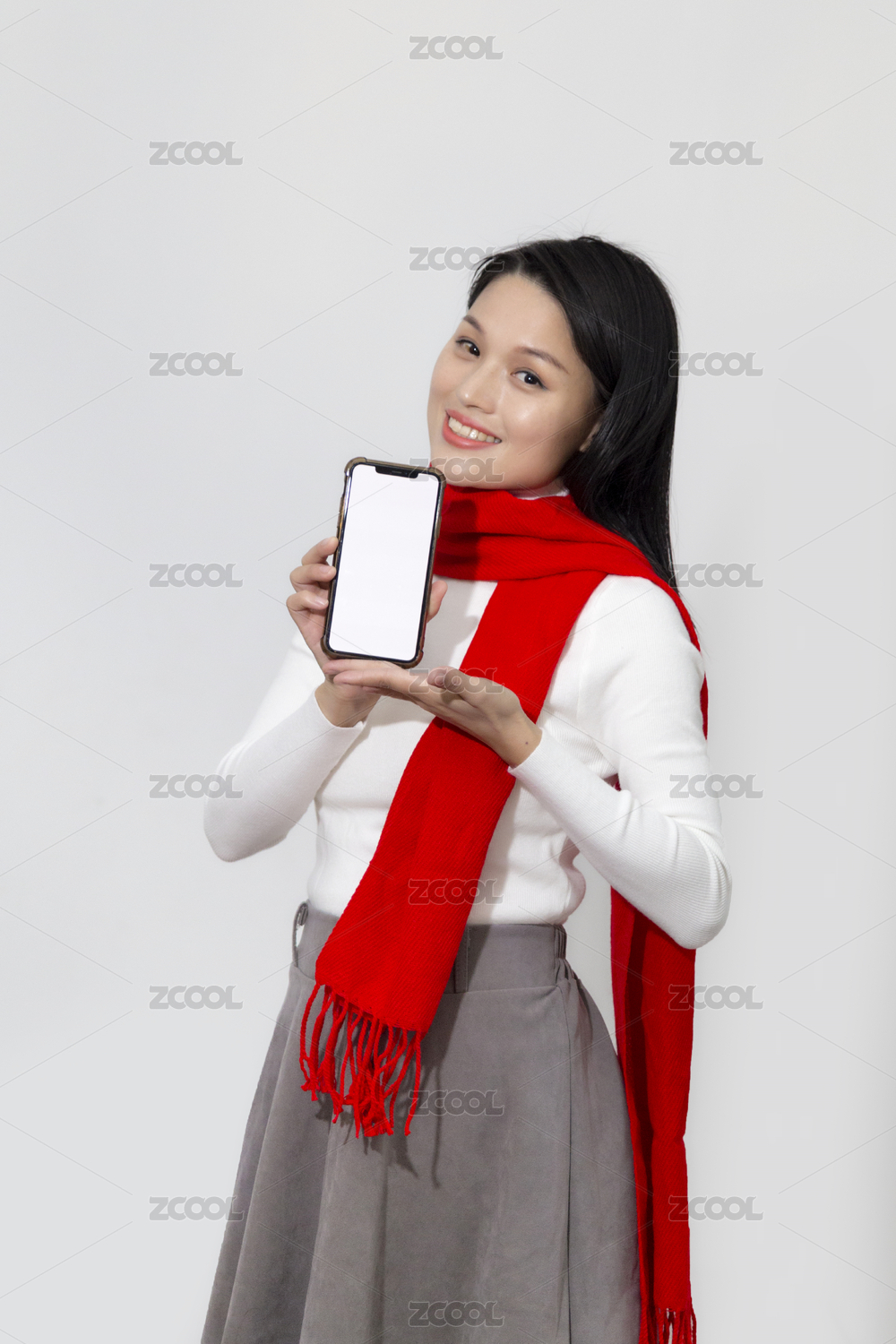 展示手機的長頭發(fā)紅圍巾東方女人