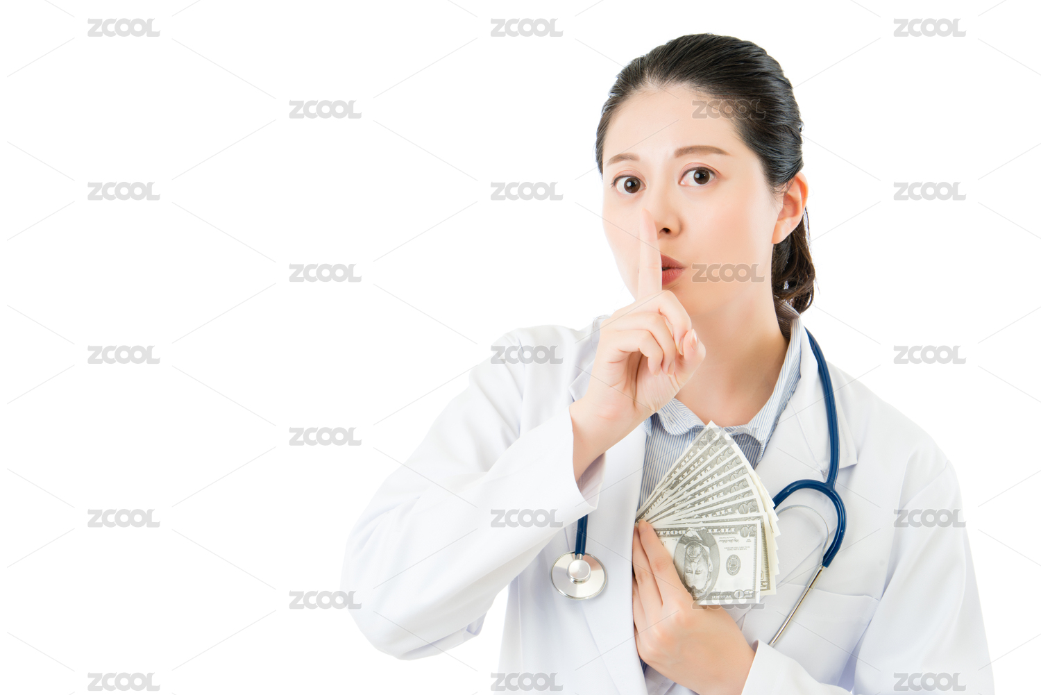 亞洲女醫(yī)生沉默噓的手勢拿錢賄賂。隔絕在白色背景。醫(yī)療和健康理念