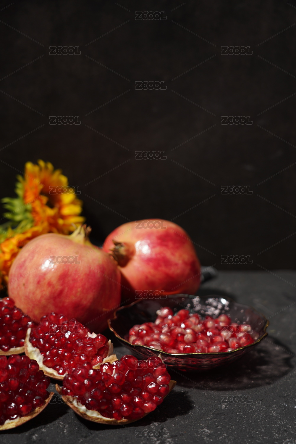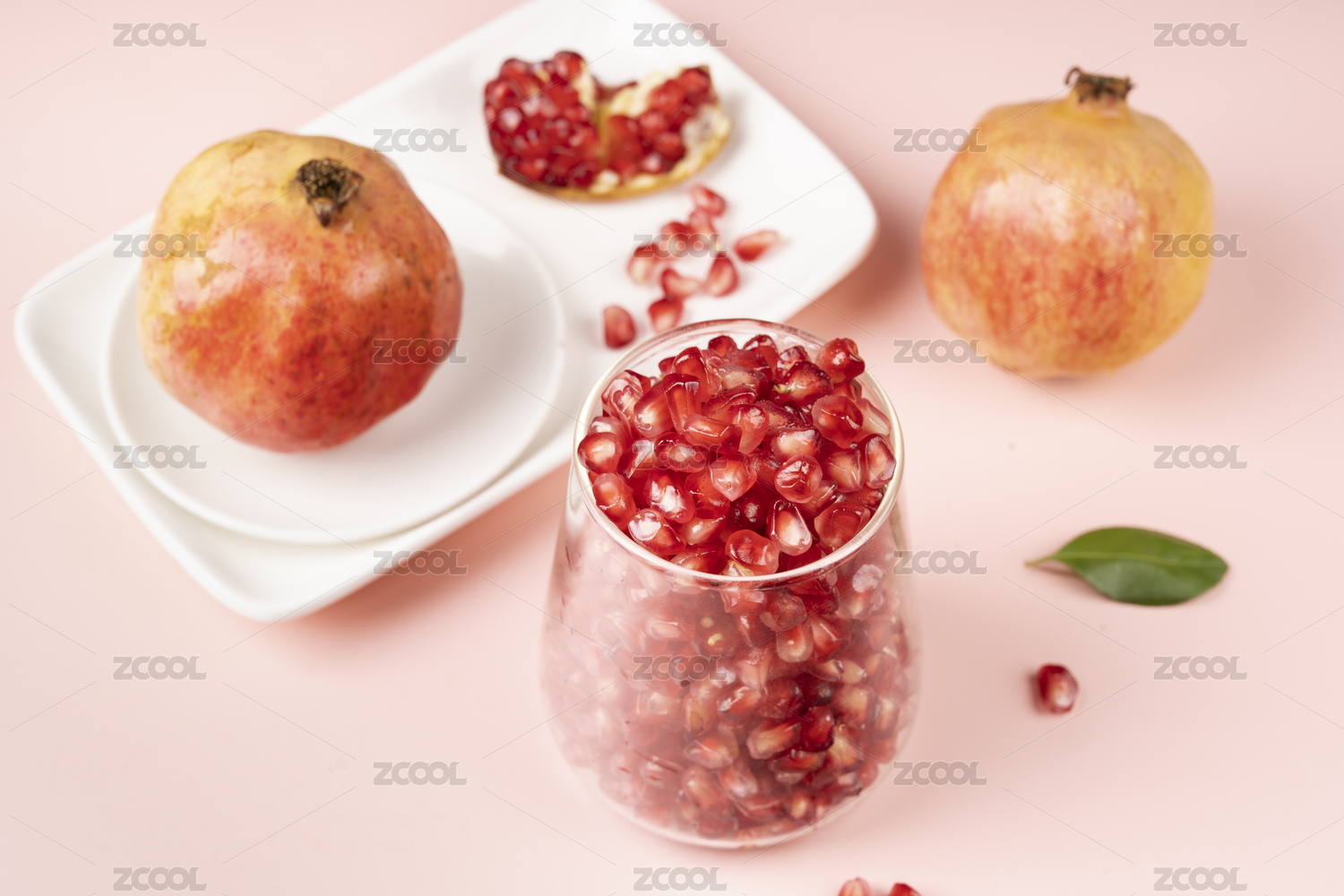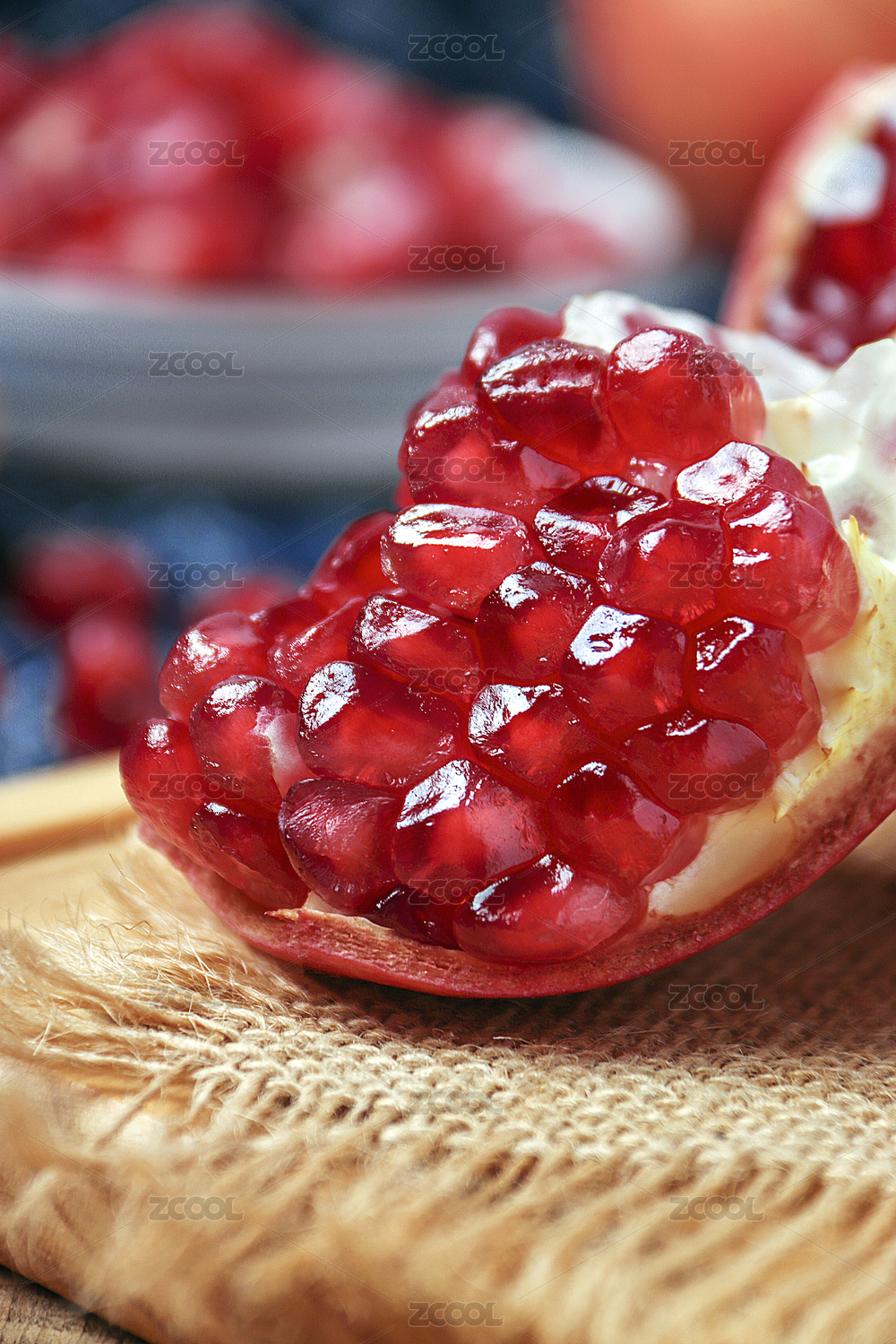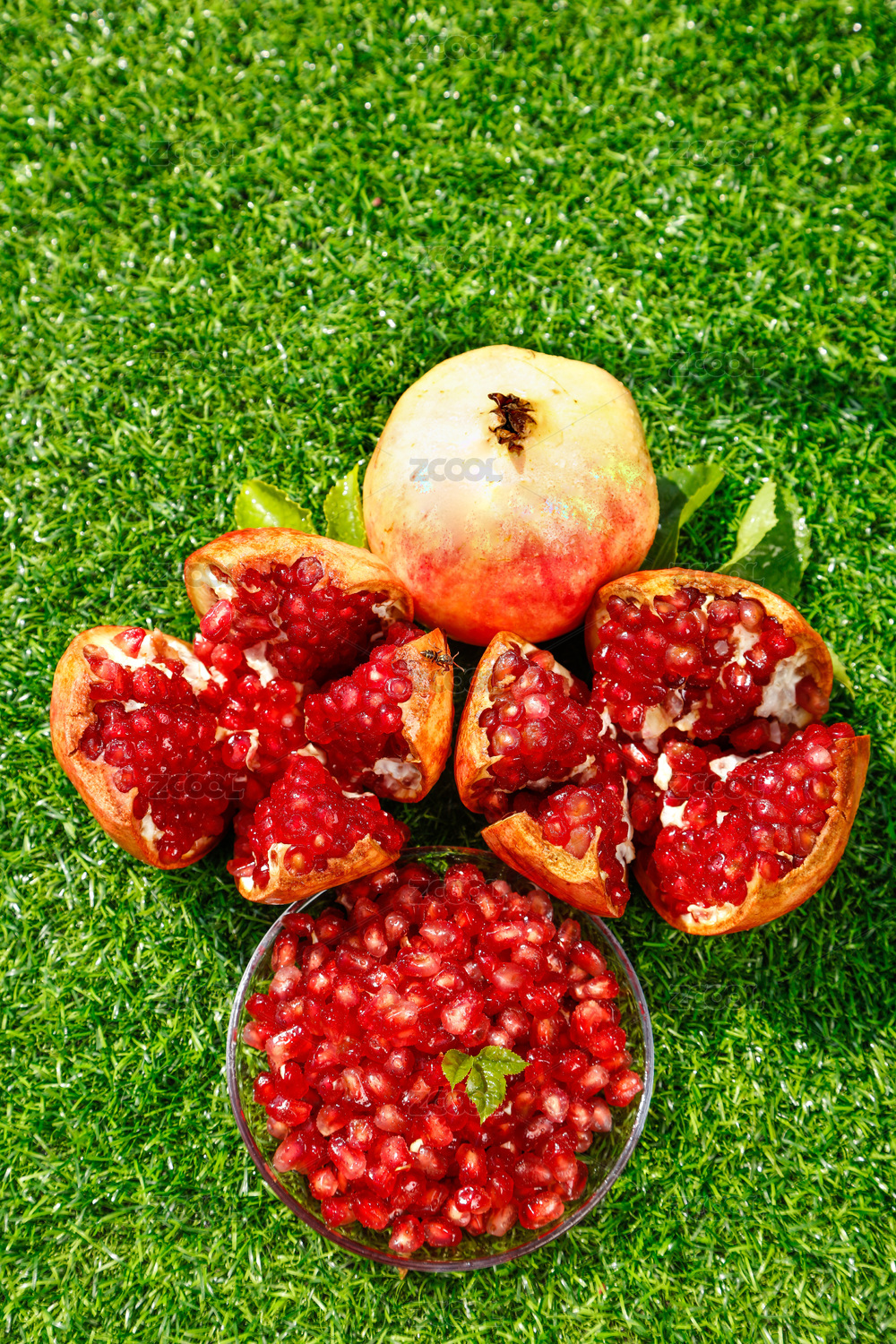 綠色草坪上放著剝開的紅石榴和石榴籽