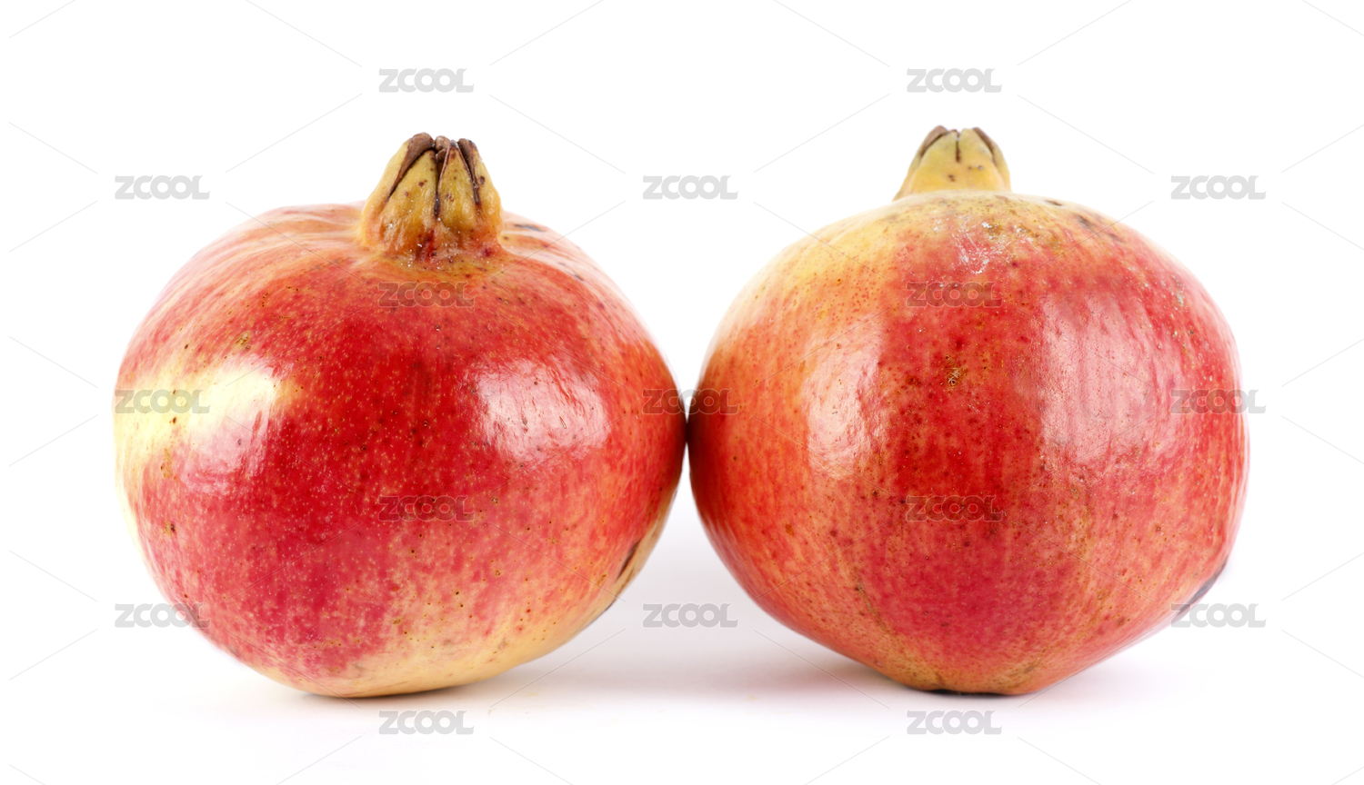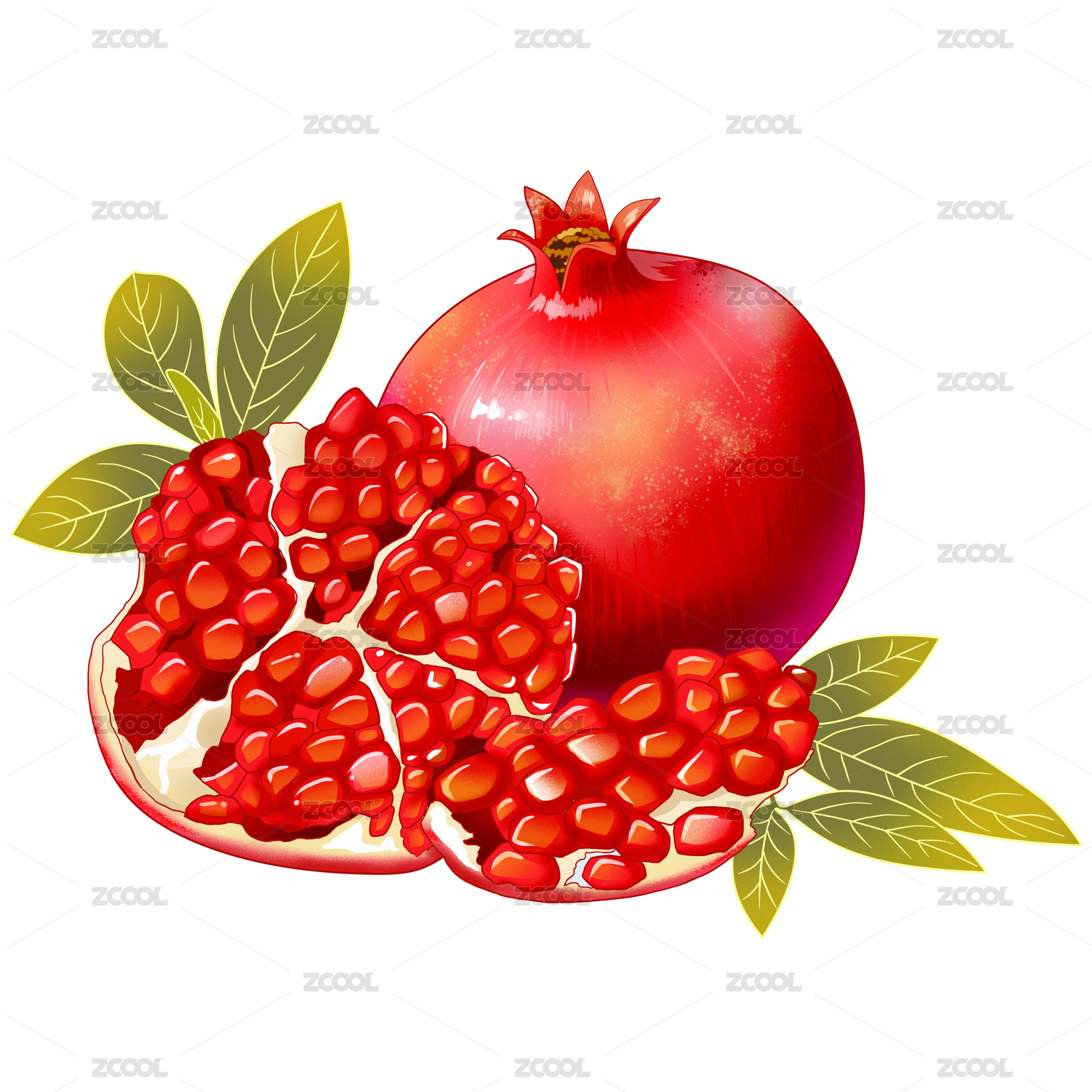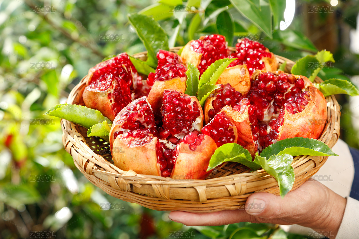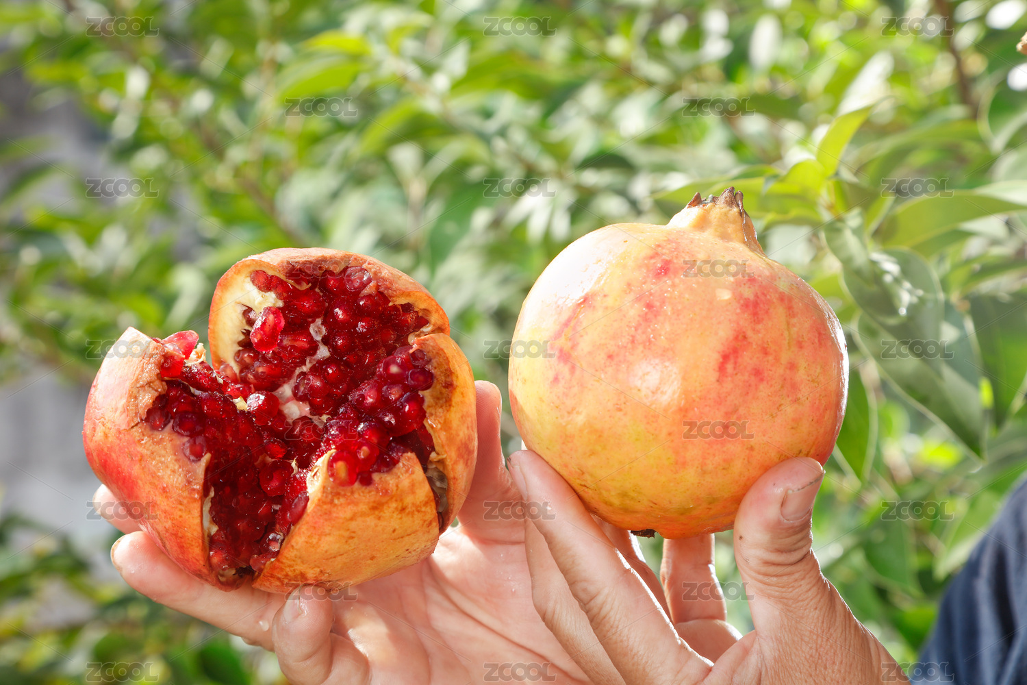 手上拿著一個完整的石榴和一個剝開的紅石榴