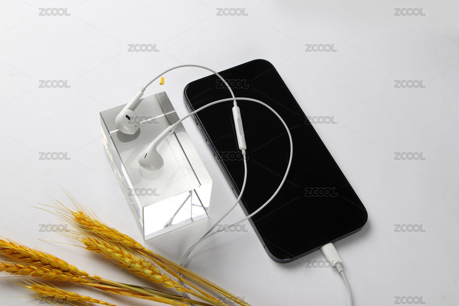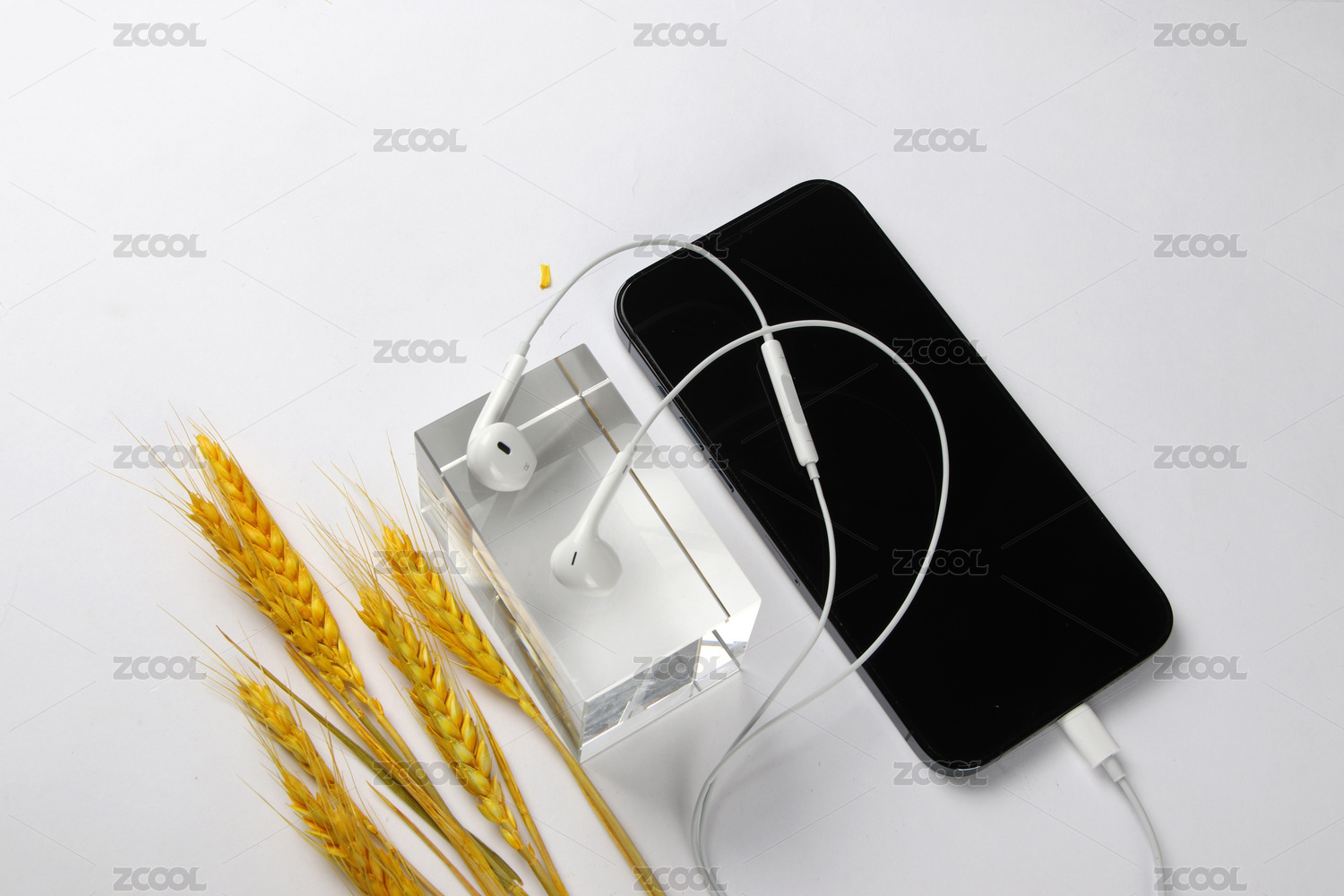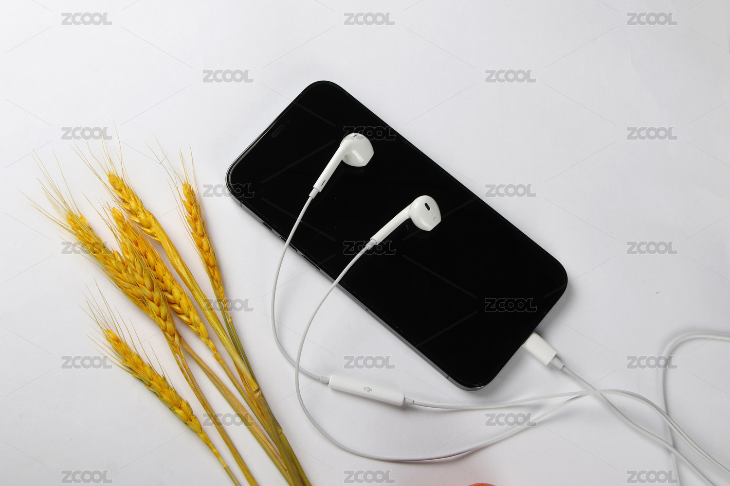白色背景下金色麥子裝飾的手機與有線耳機