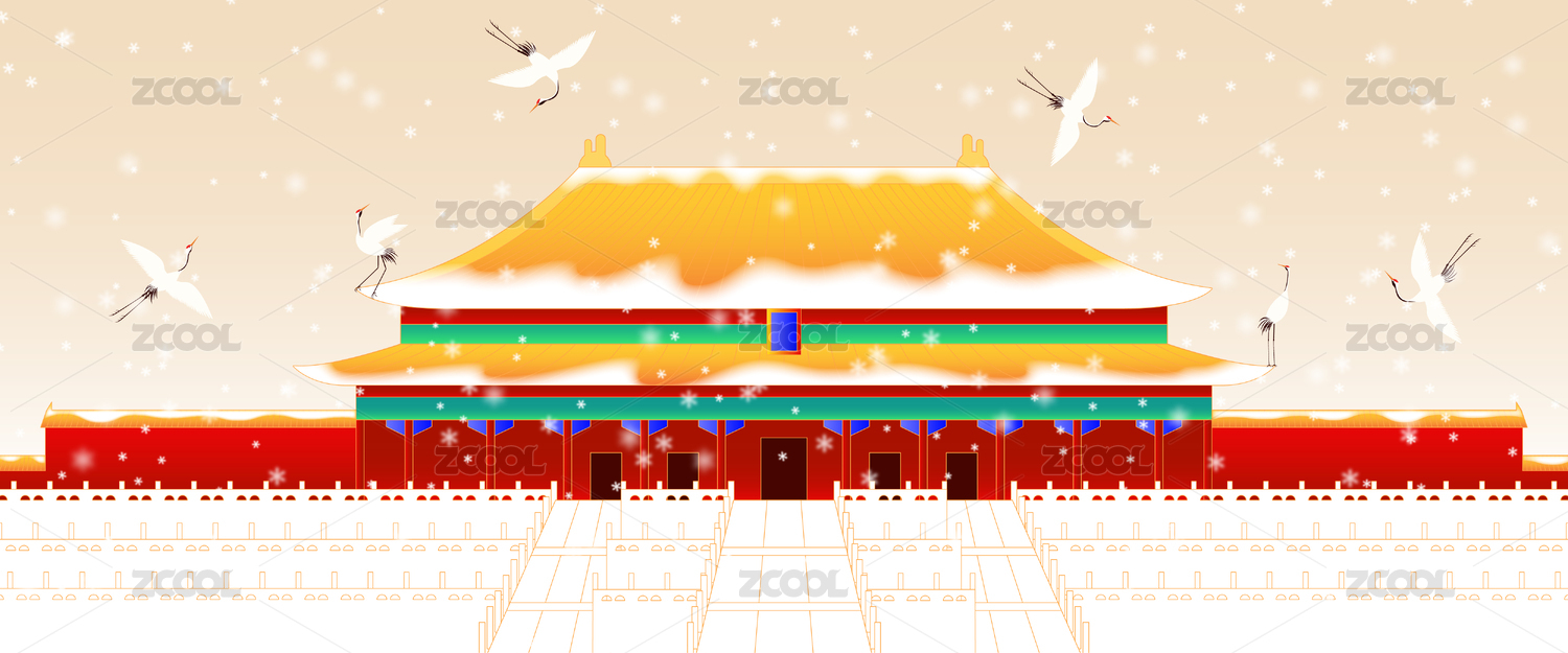 大雪中的皇家建筑與仙鶴