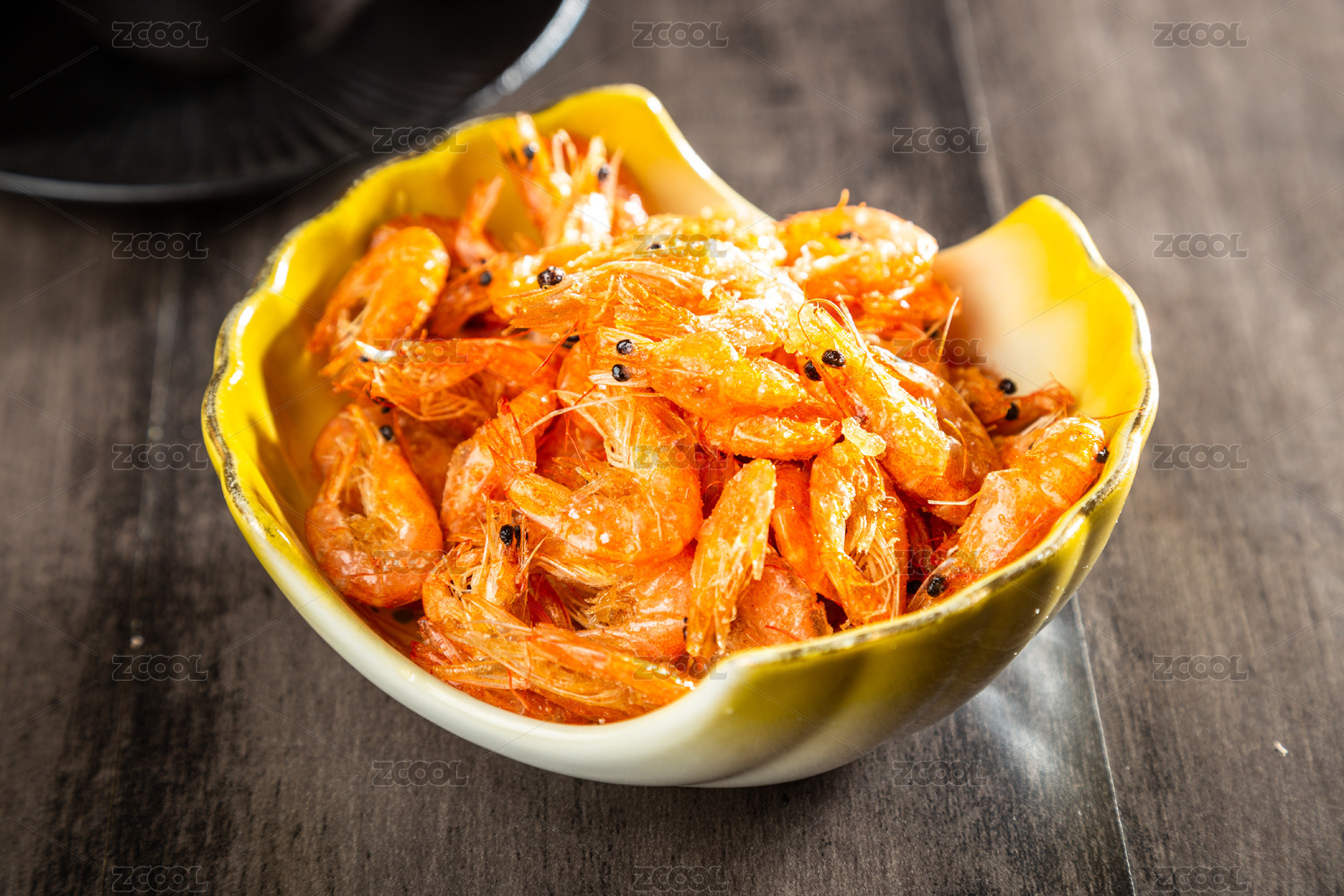 黑色木紋桌面上有一份油炸河蝦