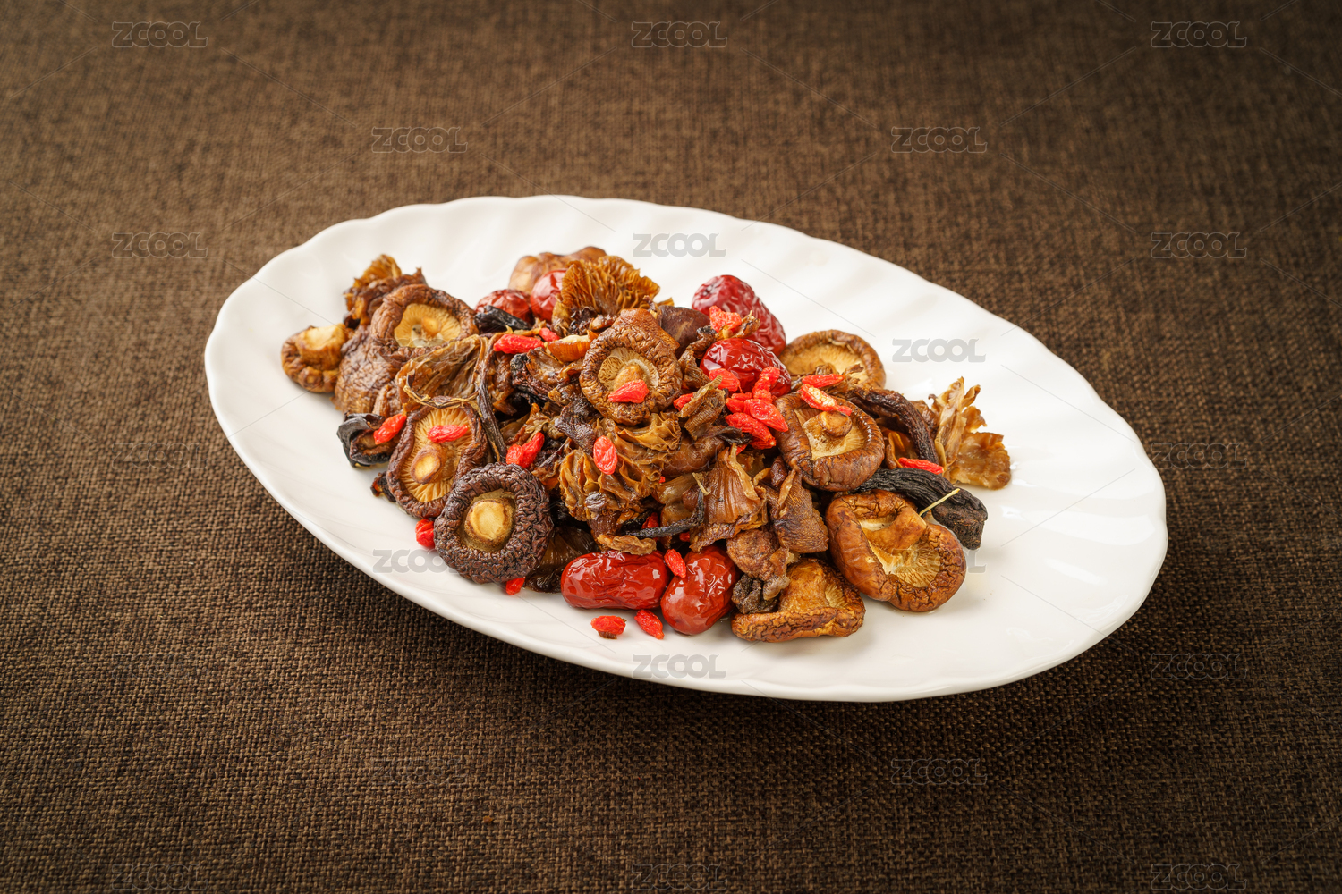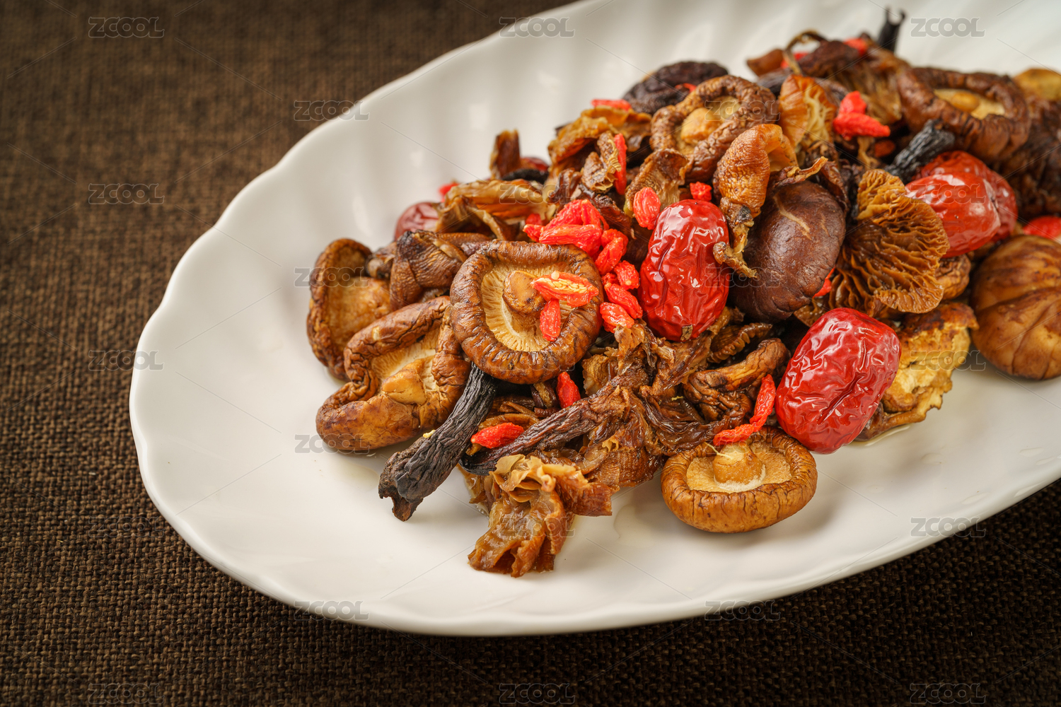 單色背景下放在白瓷盤內(nèi)的多種水洗山貨