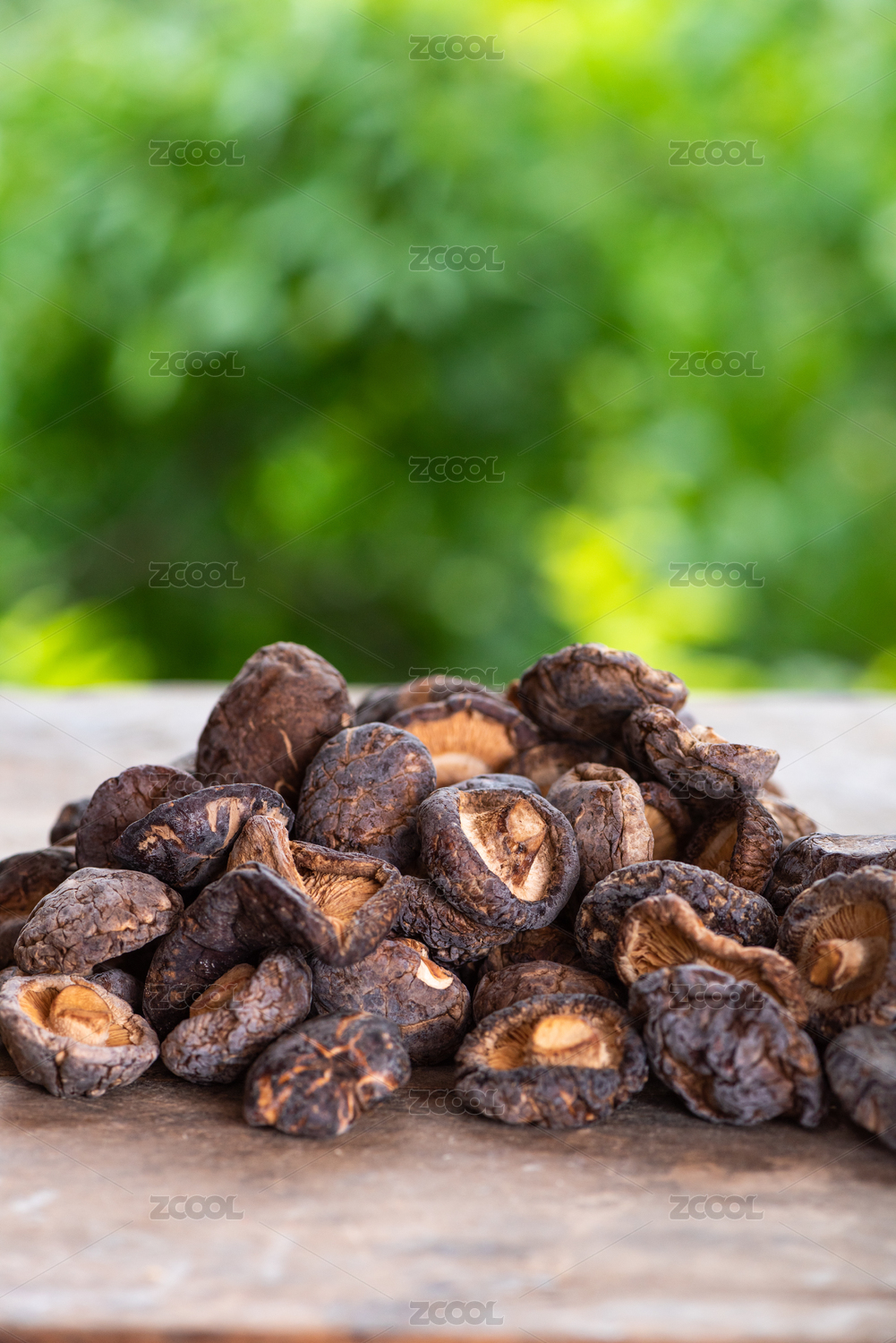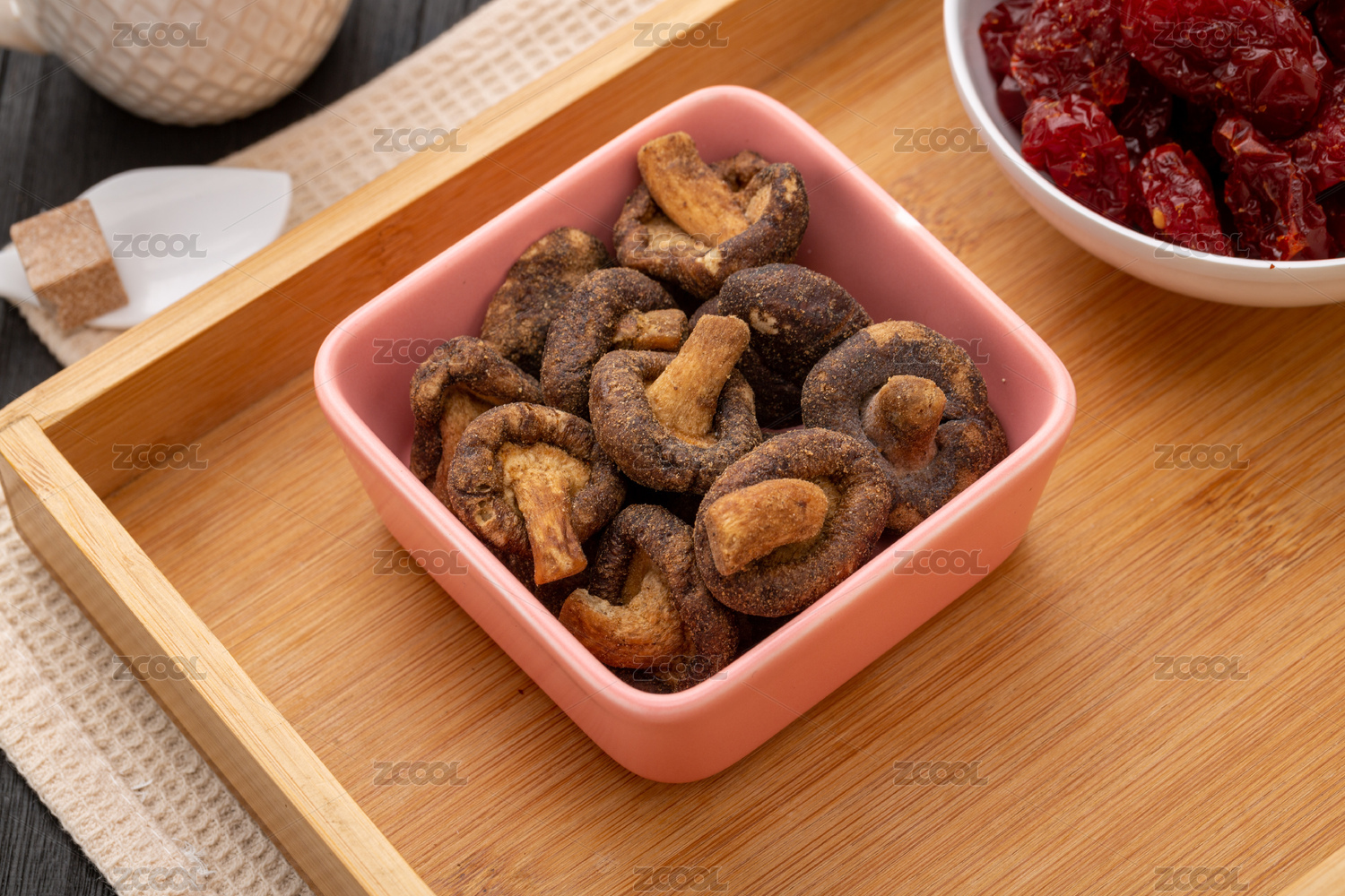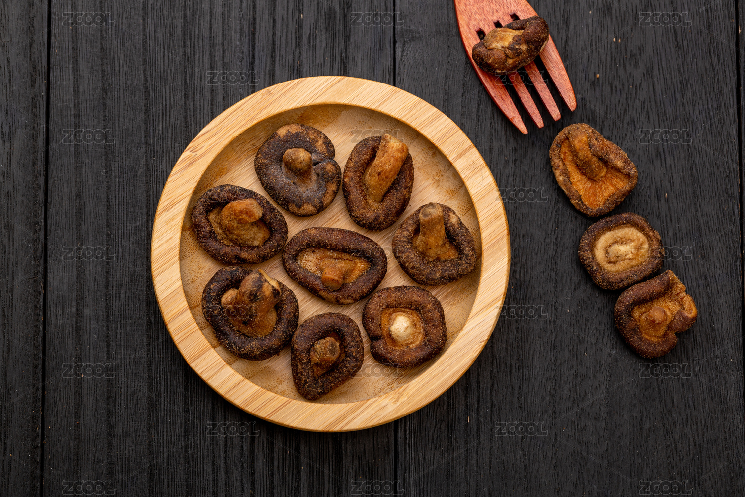 木紋背景上餐具里擺放的榛蘑蘑菇干