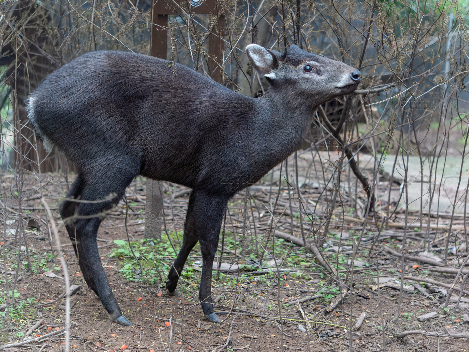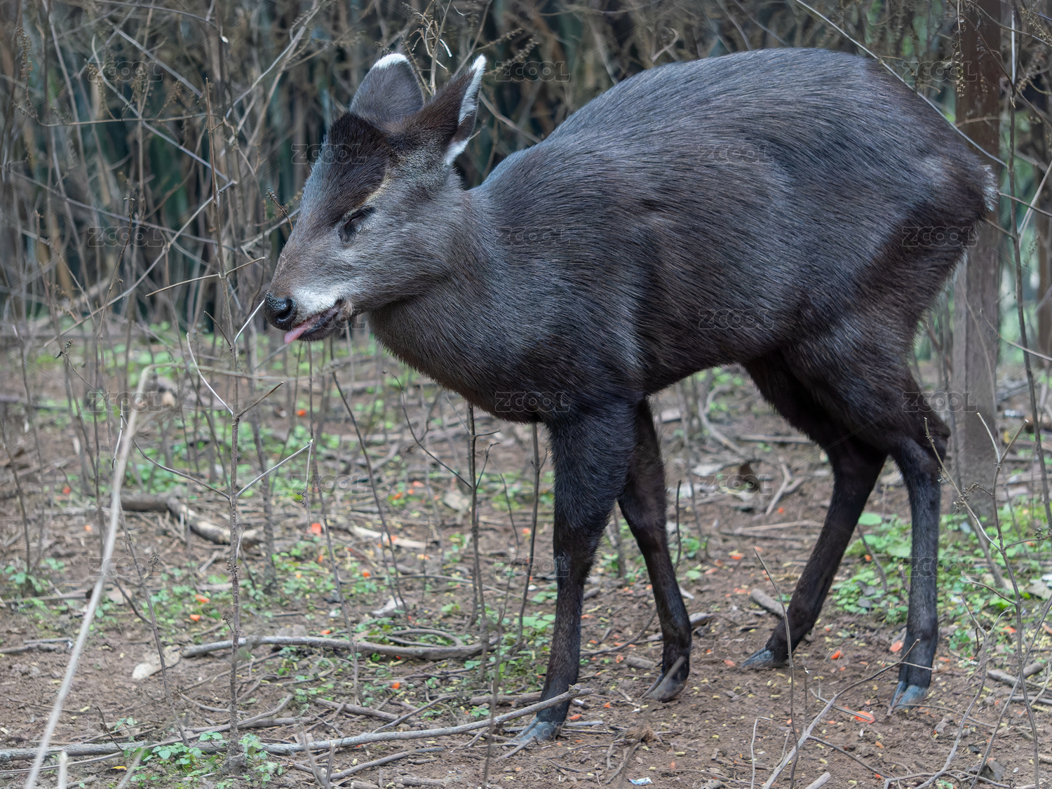 毛冠鹿在冬季的灌叢中瞇著眼睛伸出舌頭