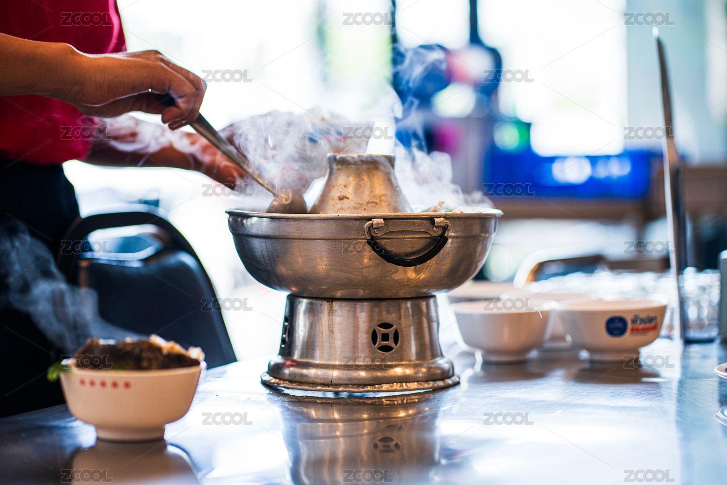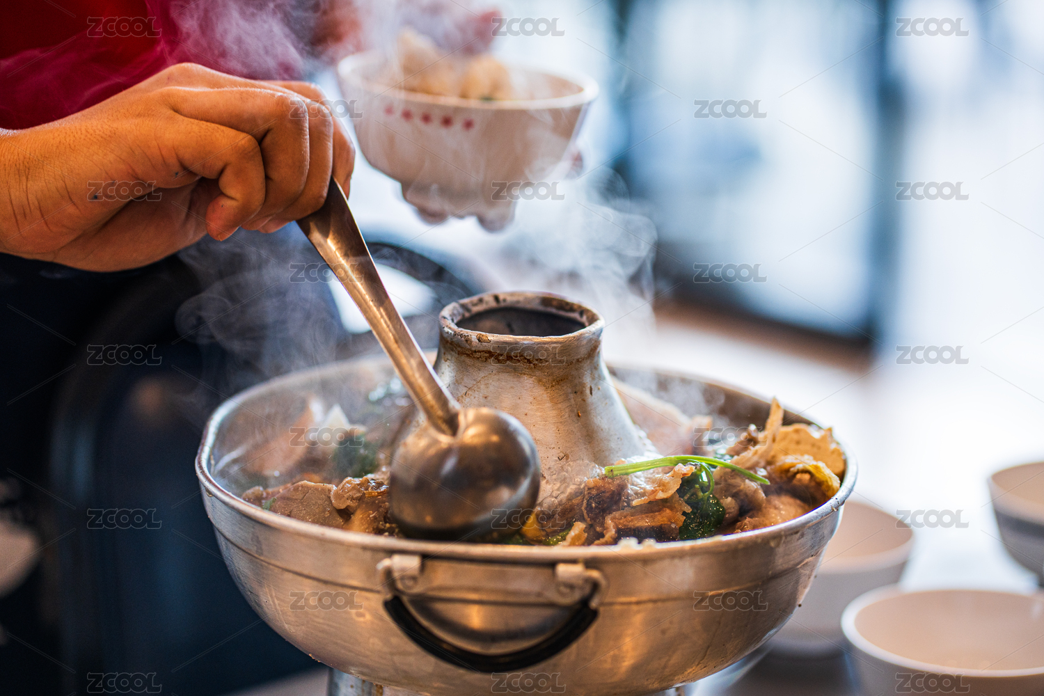 桌面上的碗里的美味可口的冬陰功湯