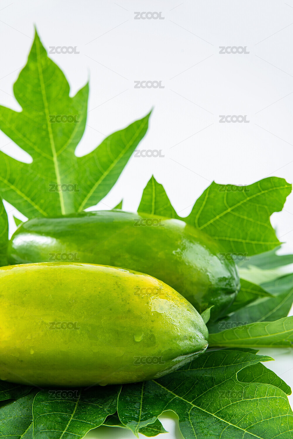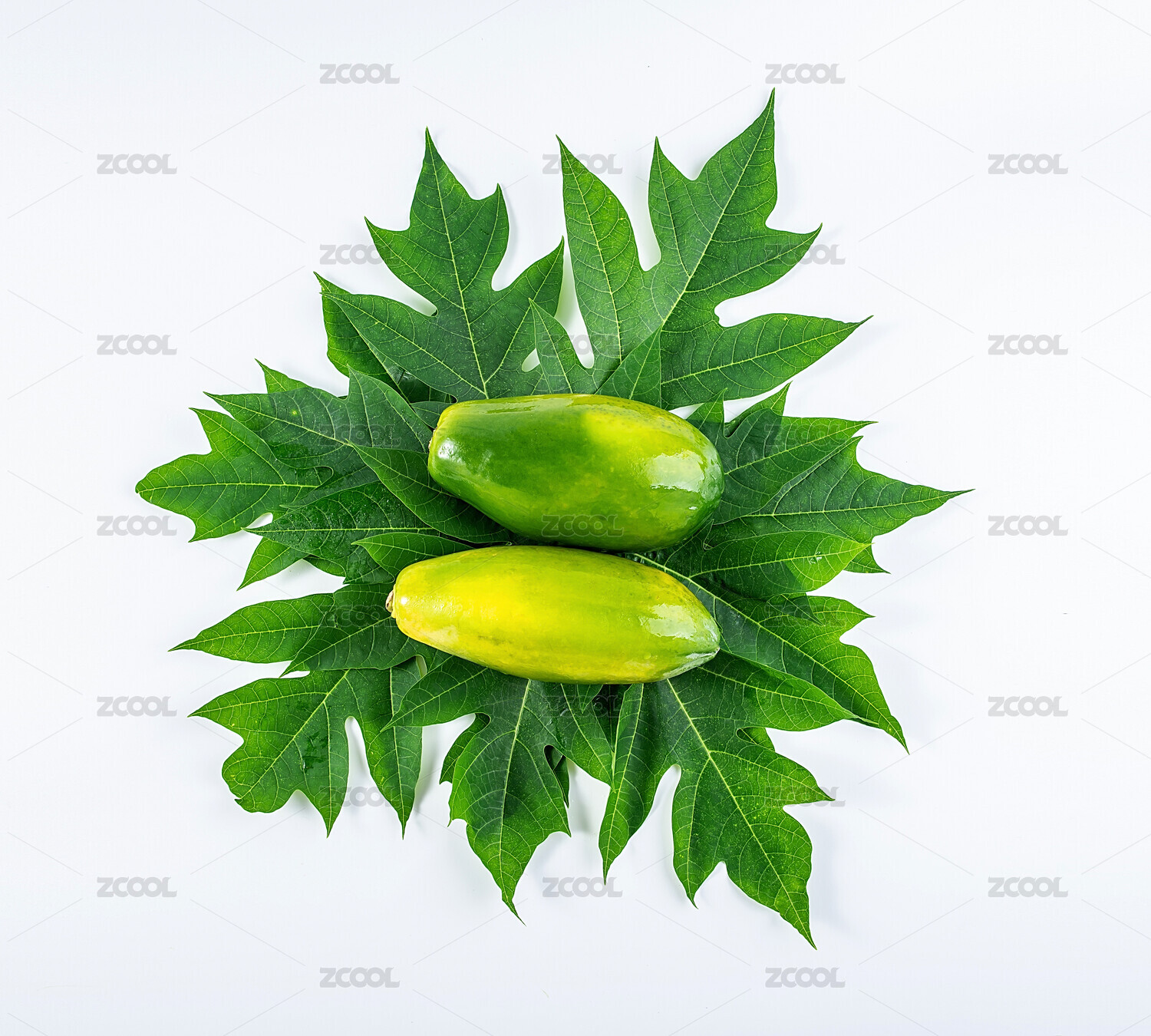 綠色木瓜樹葉上放著兩個青木瓜