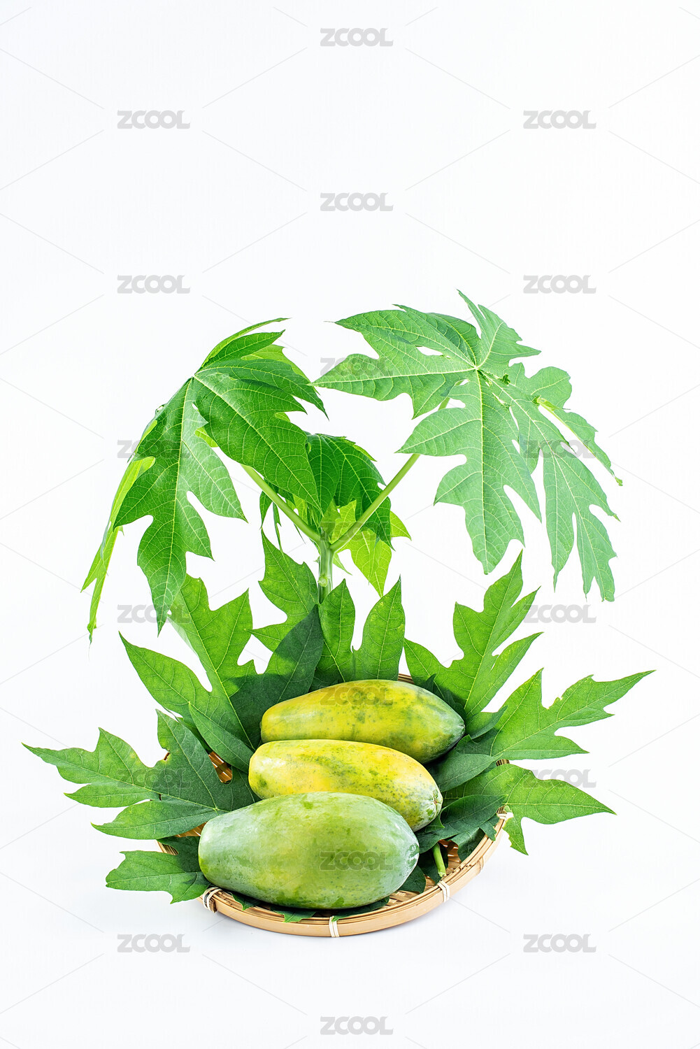 白底上的萬壽果和藍子里的新鮮青皮木瓜