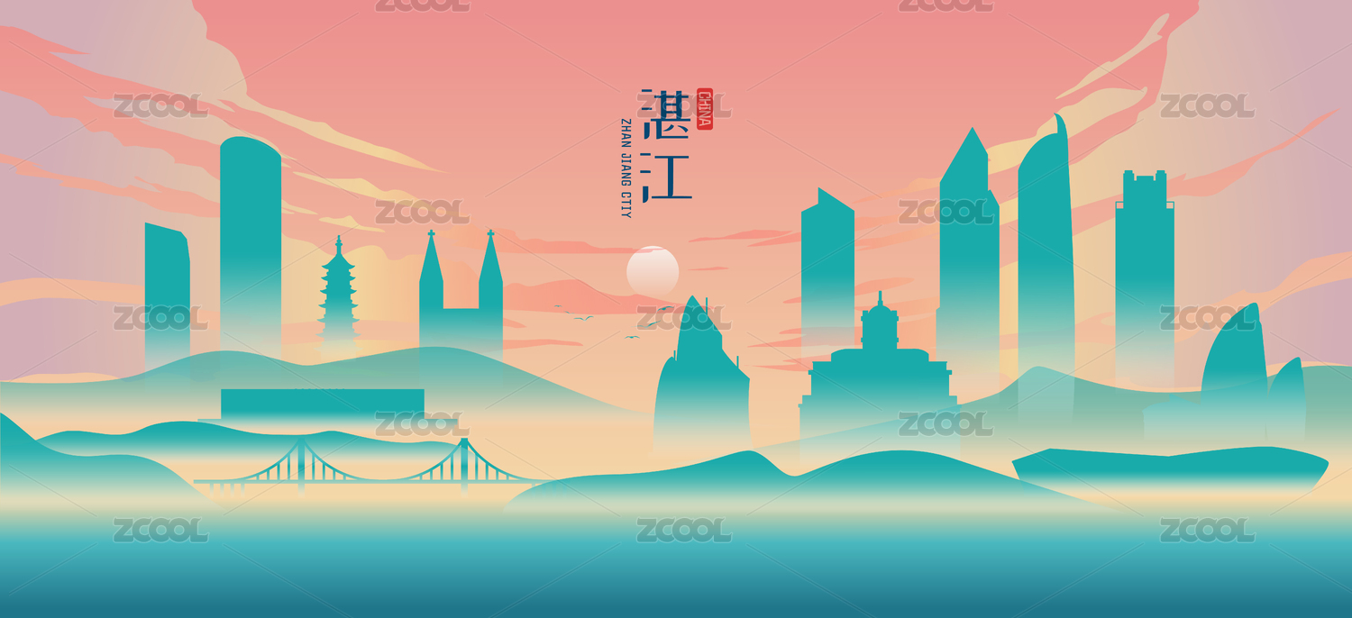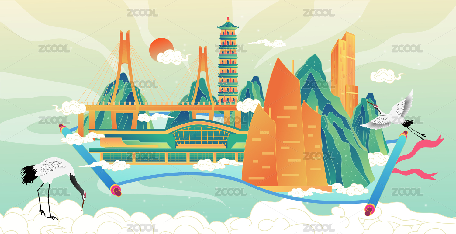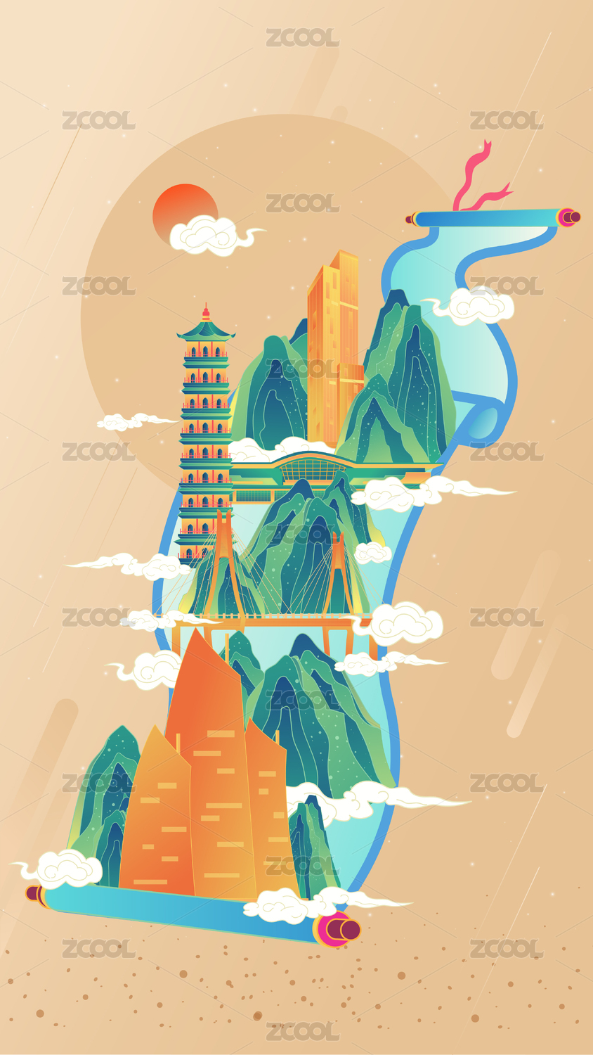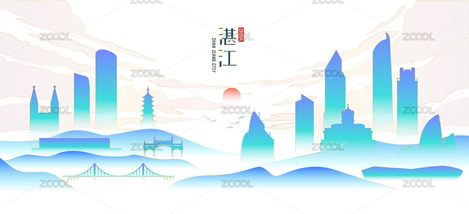 湛江山水畫中國風城市復古打卡地標旅游建筑