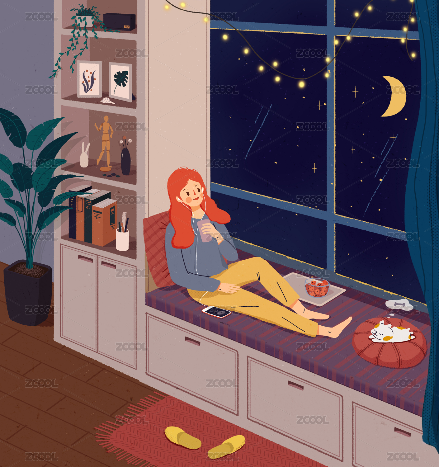 一個紅頭發(fā)女孩在月光下坐在床邊戴著耳機聽音樂