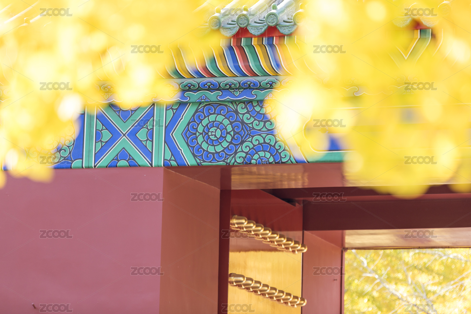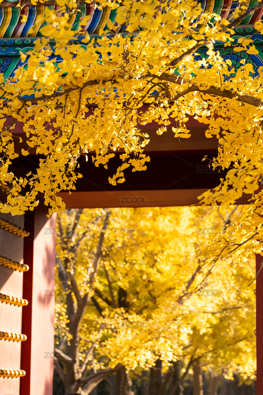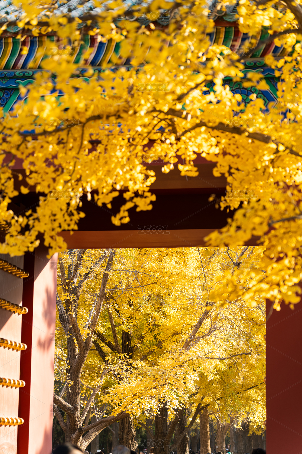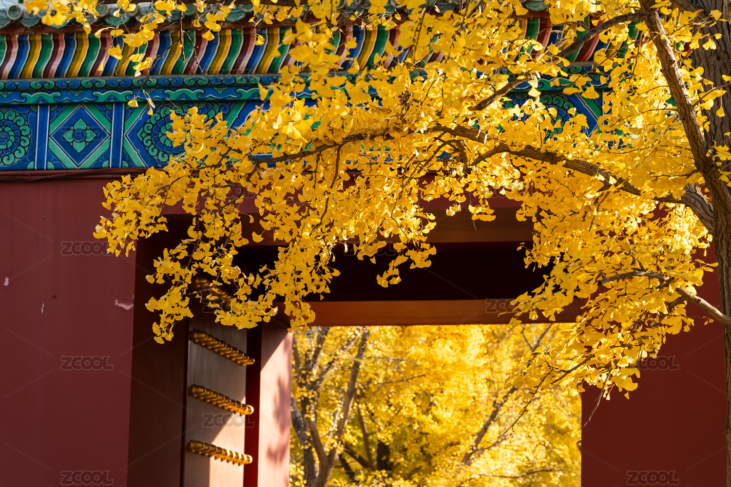 深秋藍天下的地壇宮殿與黃色銀杏樹