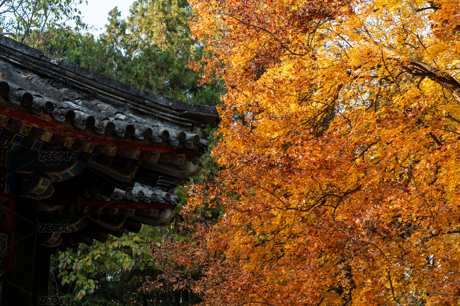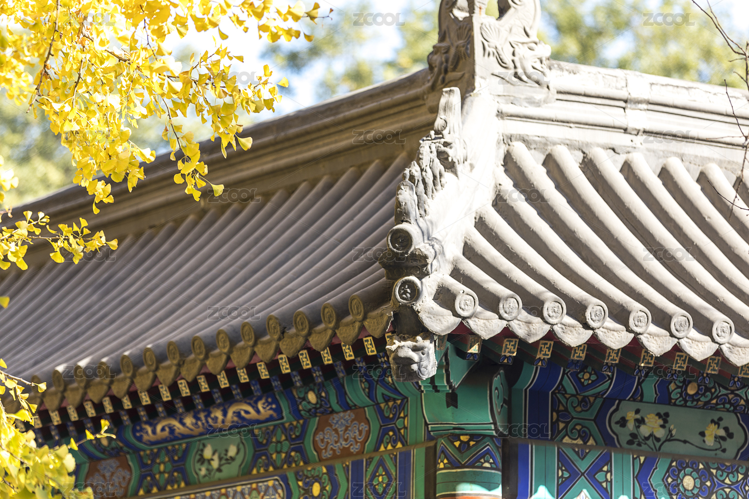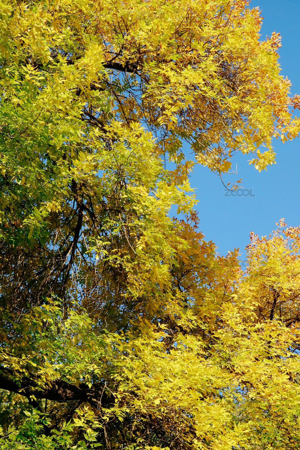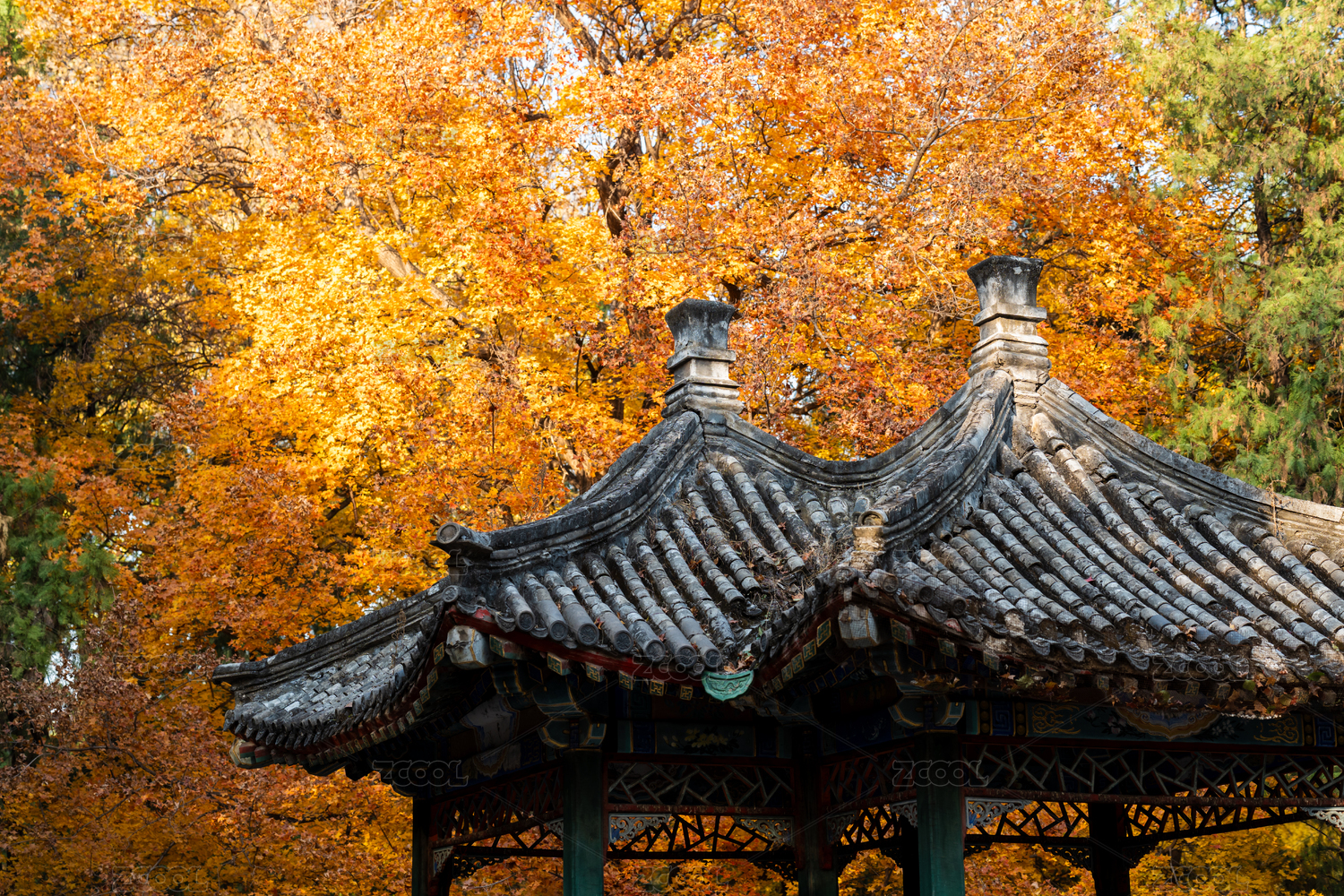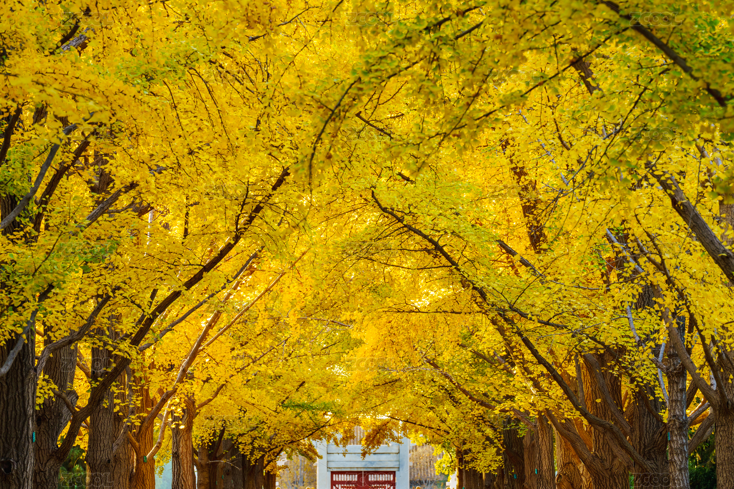 深秋藍天下的地壇宮殿與黃色銀杏樹