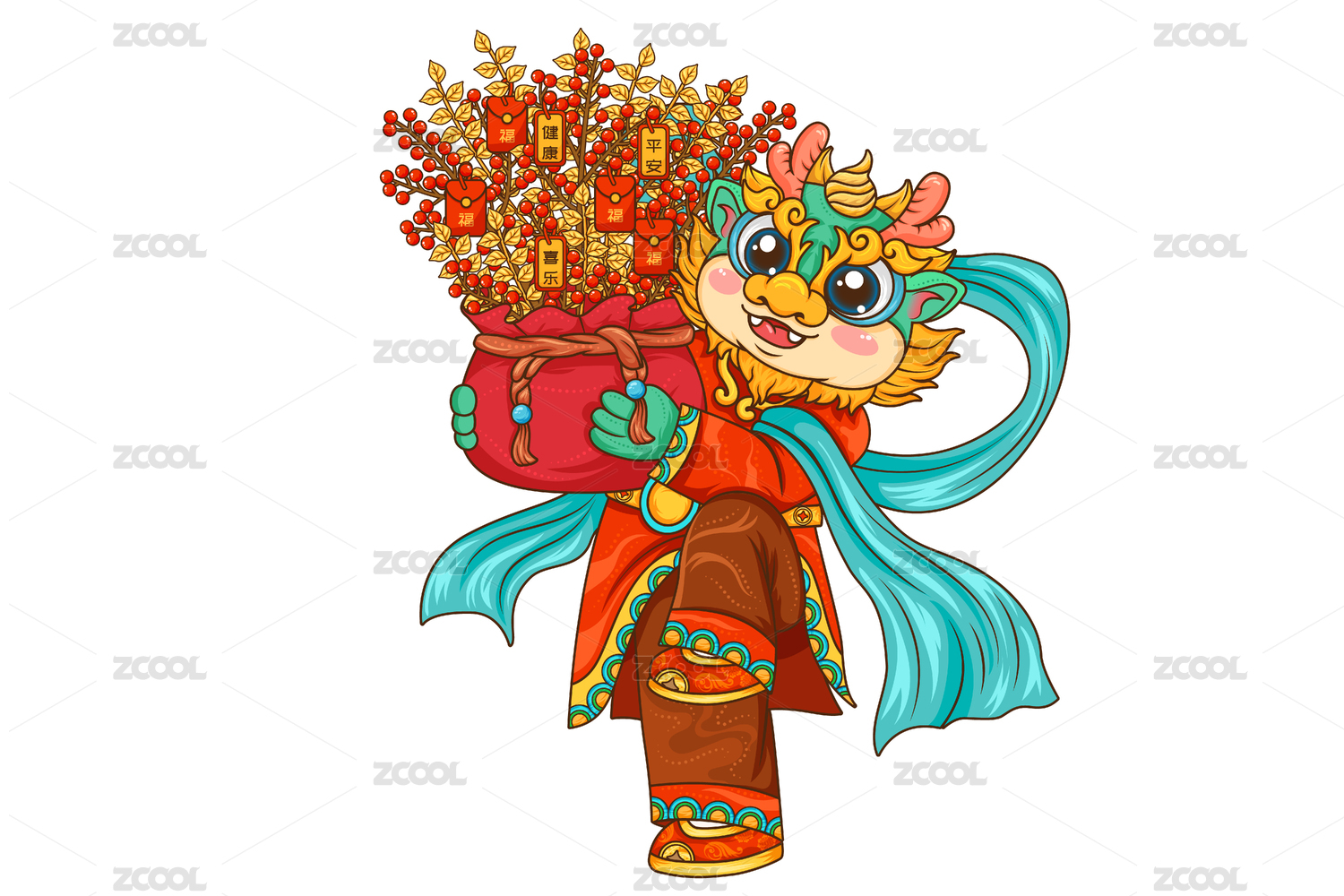 矢量國潮龍年吉祥人物ip形象有錢花插畫