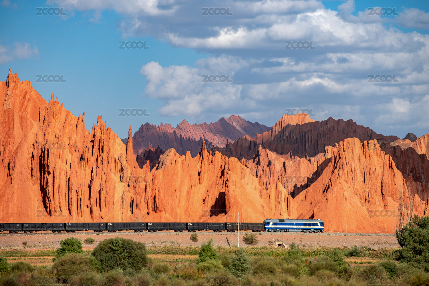 新疆貨運列車經過紅山石林