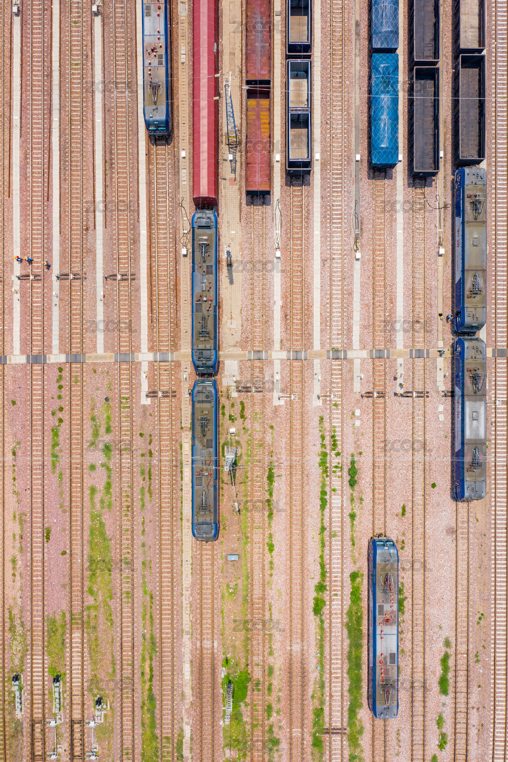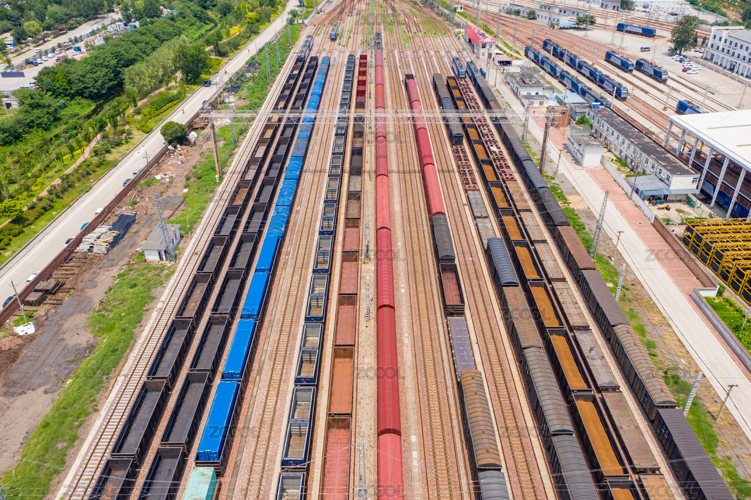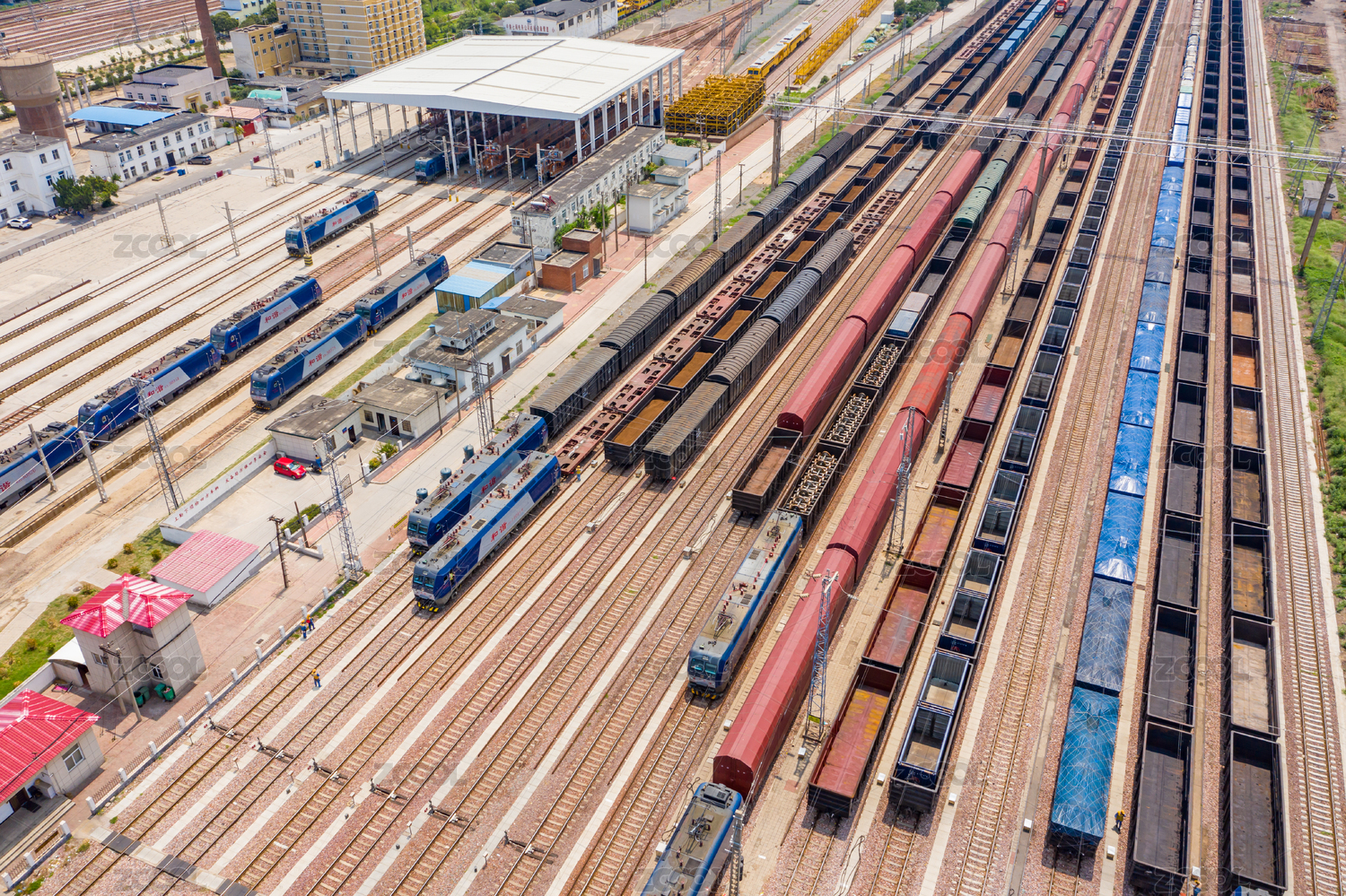 鄭州北站鐵路編組站上行出發(fā)場鐵軌貨運列車