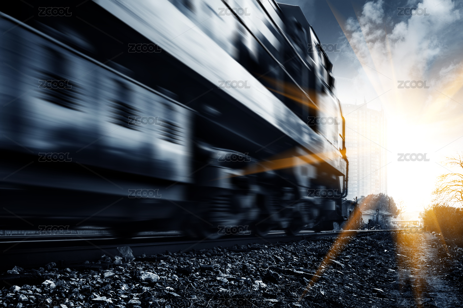 貨運列車行駛在工業(yè)區(qū)鐵路旁