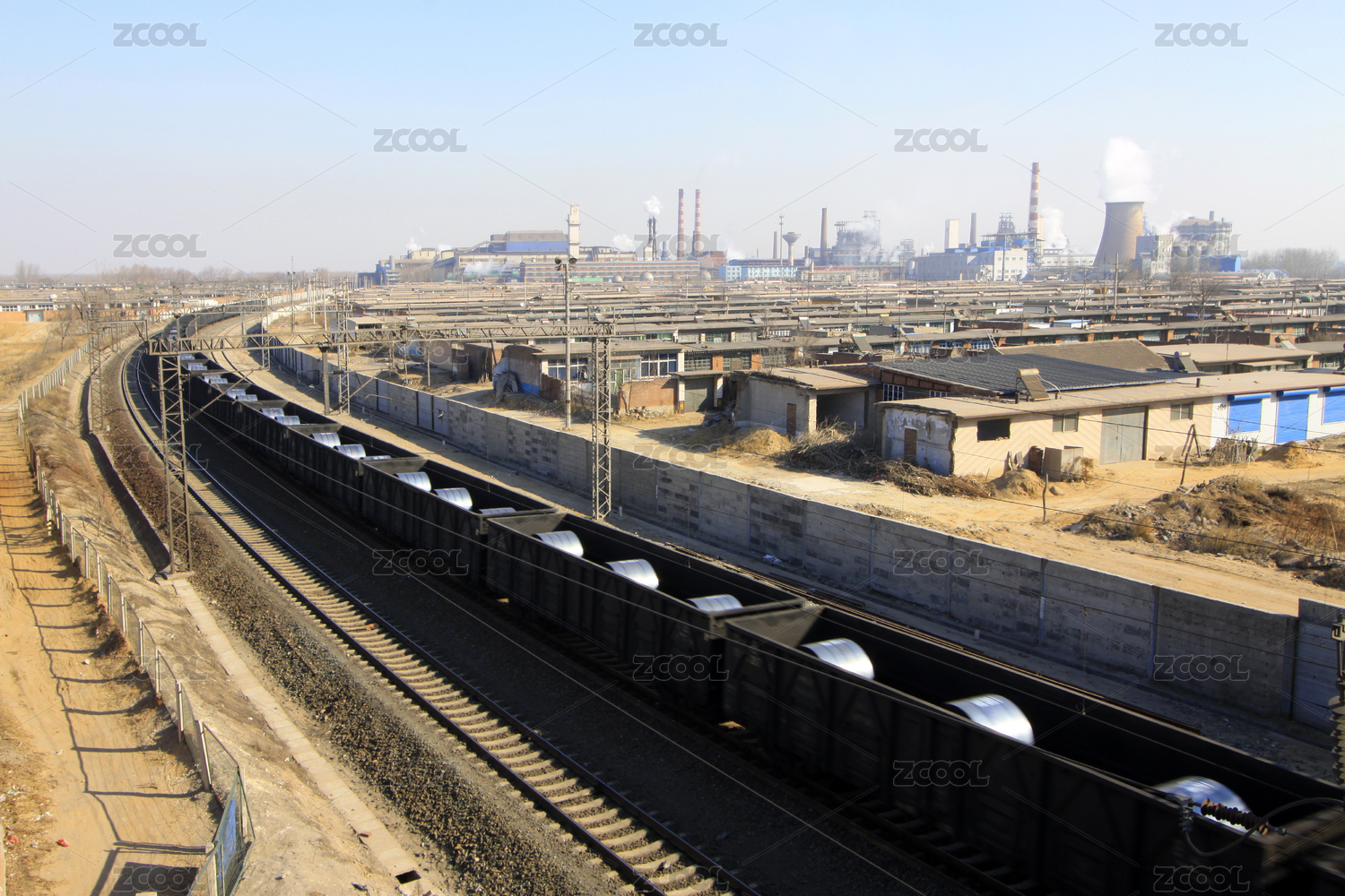 鐵路貨運列車駛過工業(yè)區(qū)