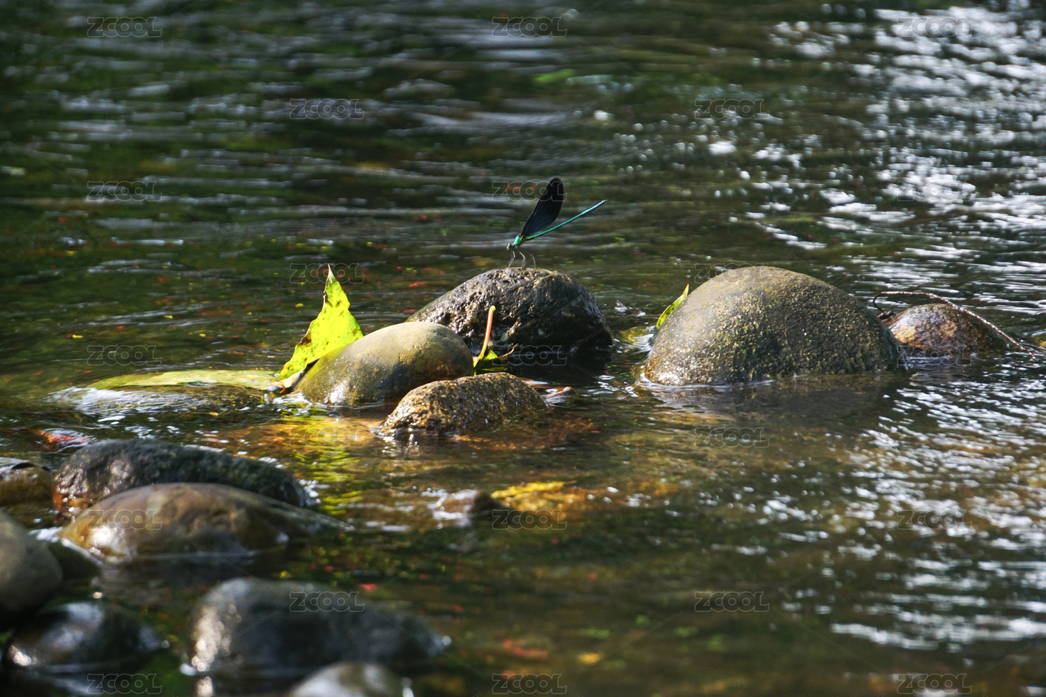 陽光下水面站立在石頭上綠色蜻蜓特寫