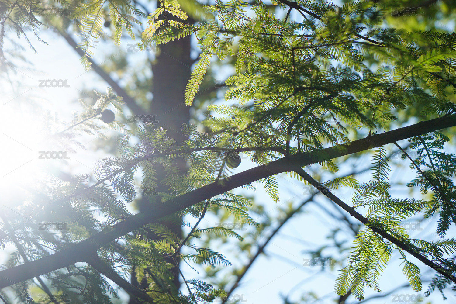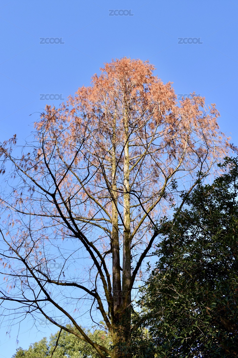 陽光下的水杉,水杉已經(jīng)變紅,藍(lán)天作背景