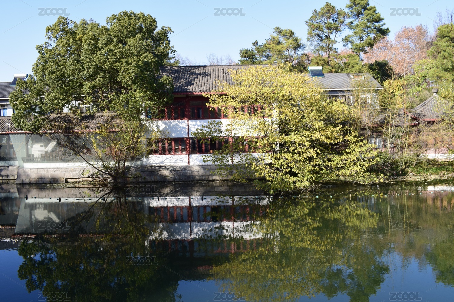 陽光下的房屋,倒影在水面上