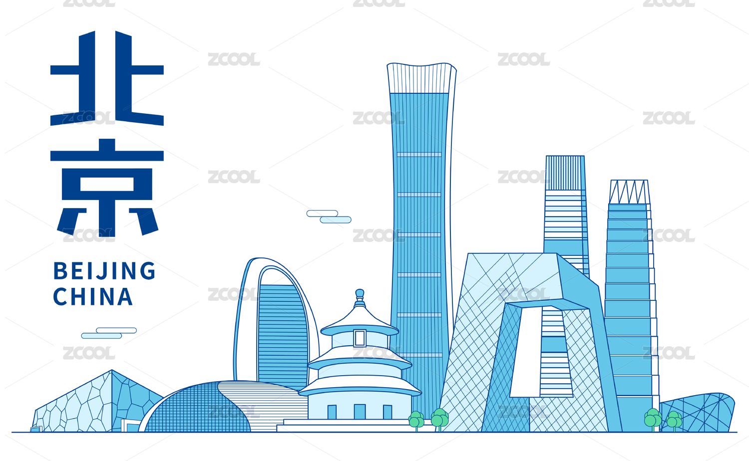 北京城市地標(biāo)建筑矢量手繪插畫藍(lán)色科技背景