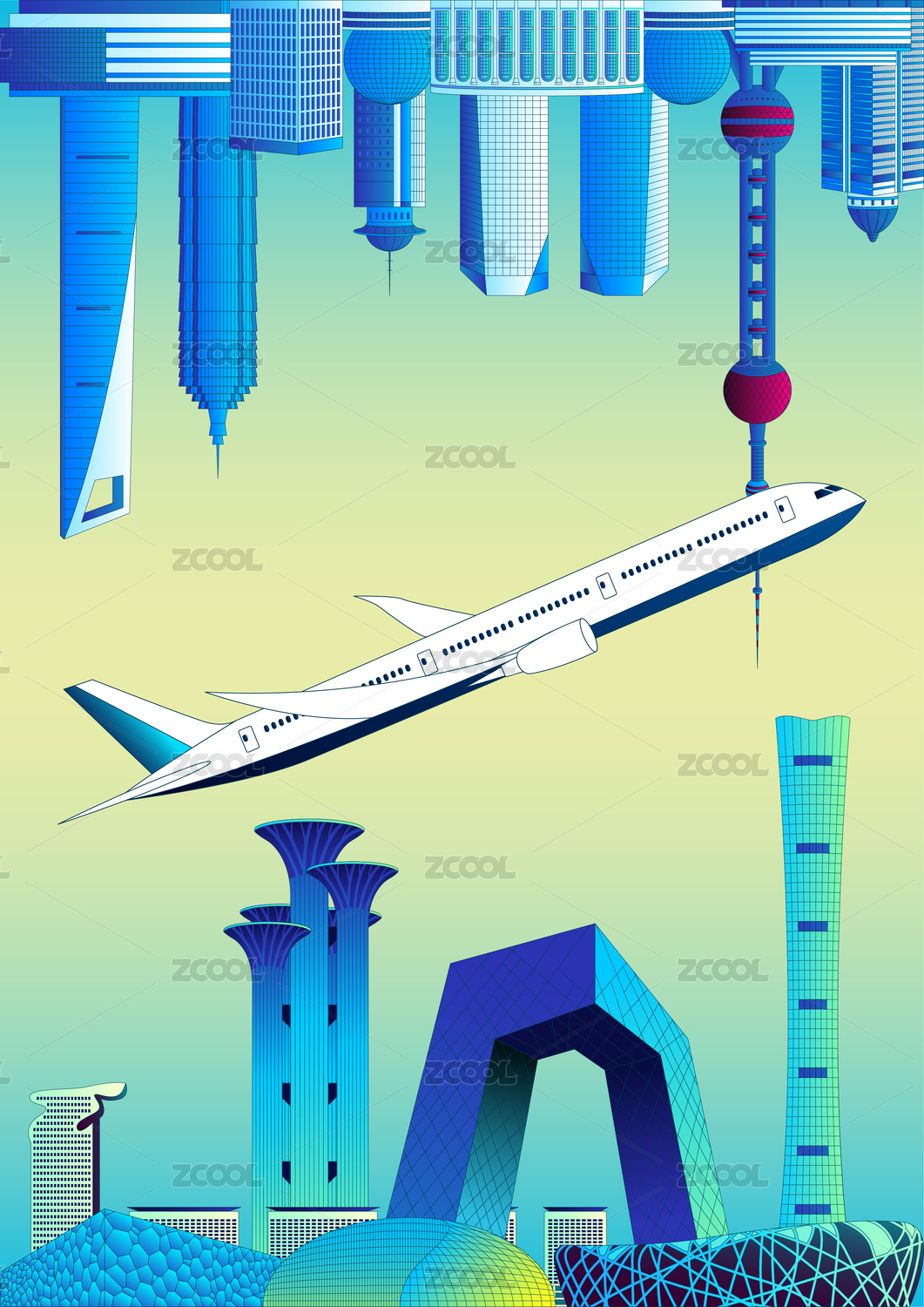 飛機(jī)穿越北京和上海的建筑群
