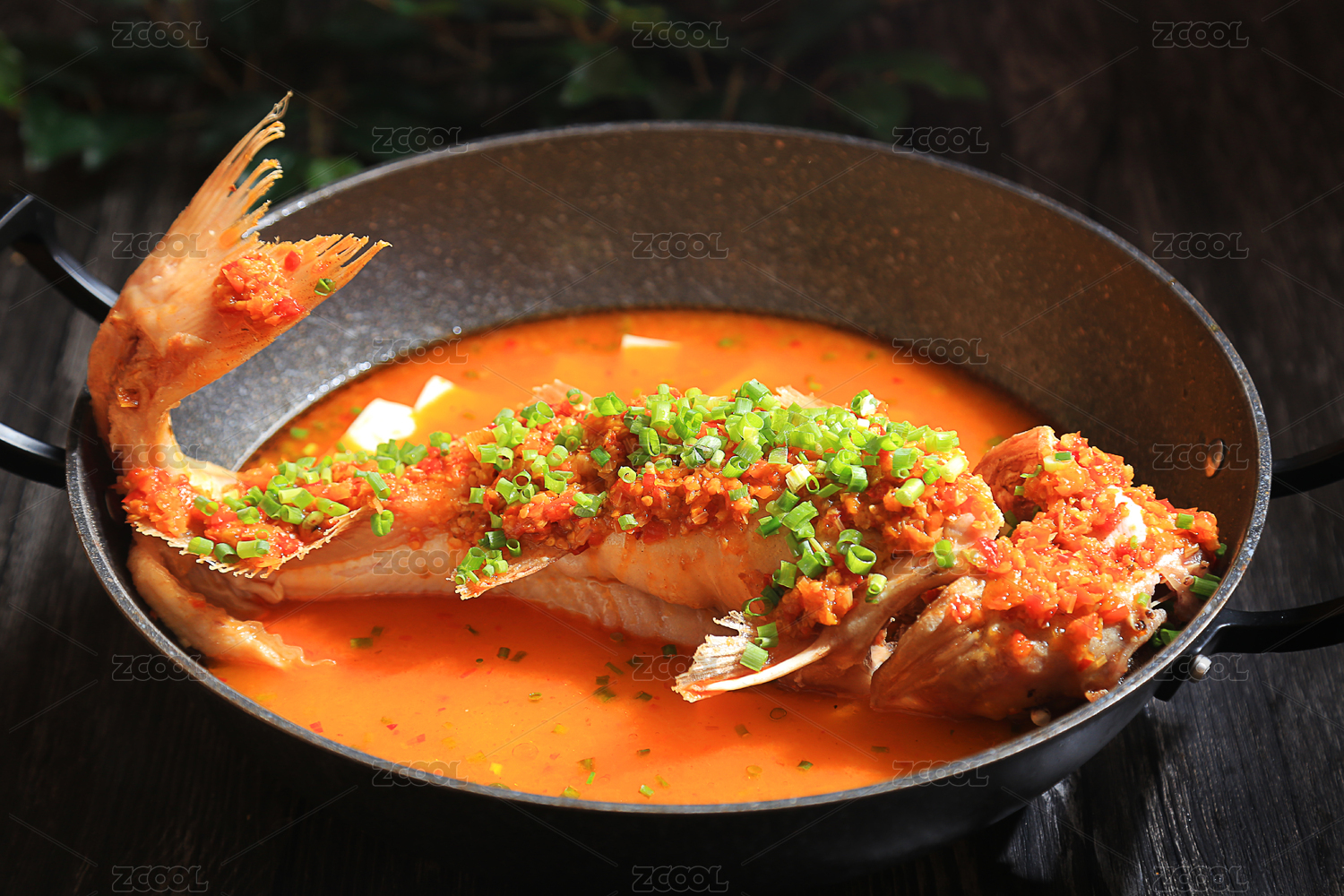 深色背景上雙柄鐵鍋中的長(zhǎng)江鮰魚(yú)