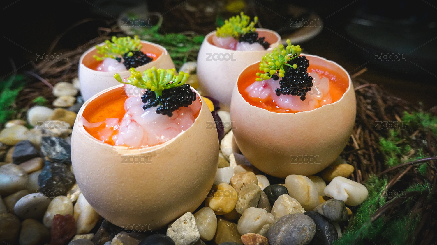 放在小石塊上用蛋殼盛著蝦油蒸蛋伴蝦仁魚子