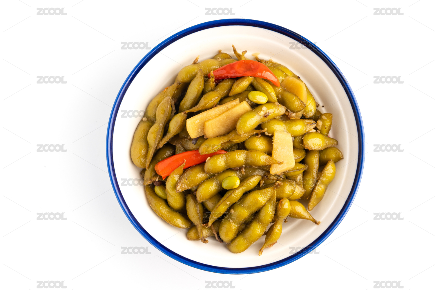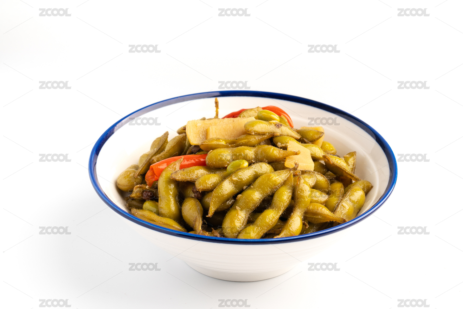 白色背景中的一碗香辣毛豆