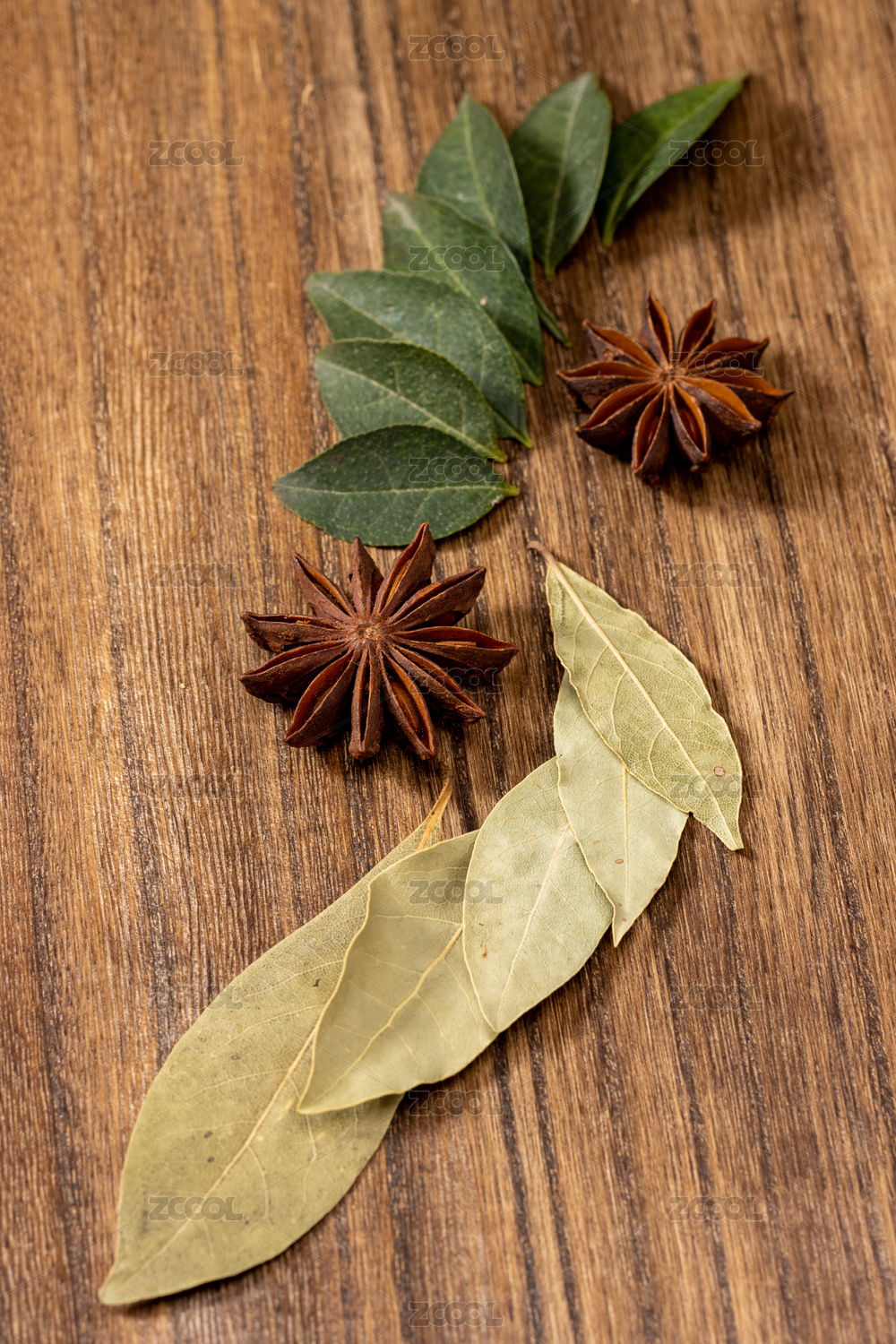 調(diào)料香料香葉擺放在桌面上特寫