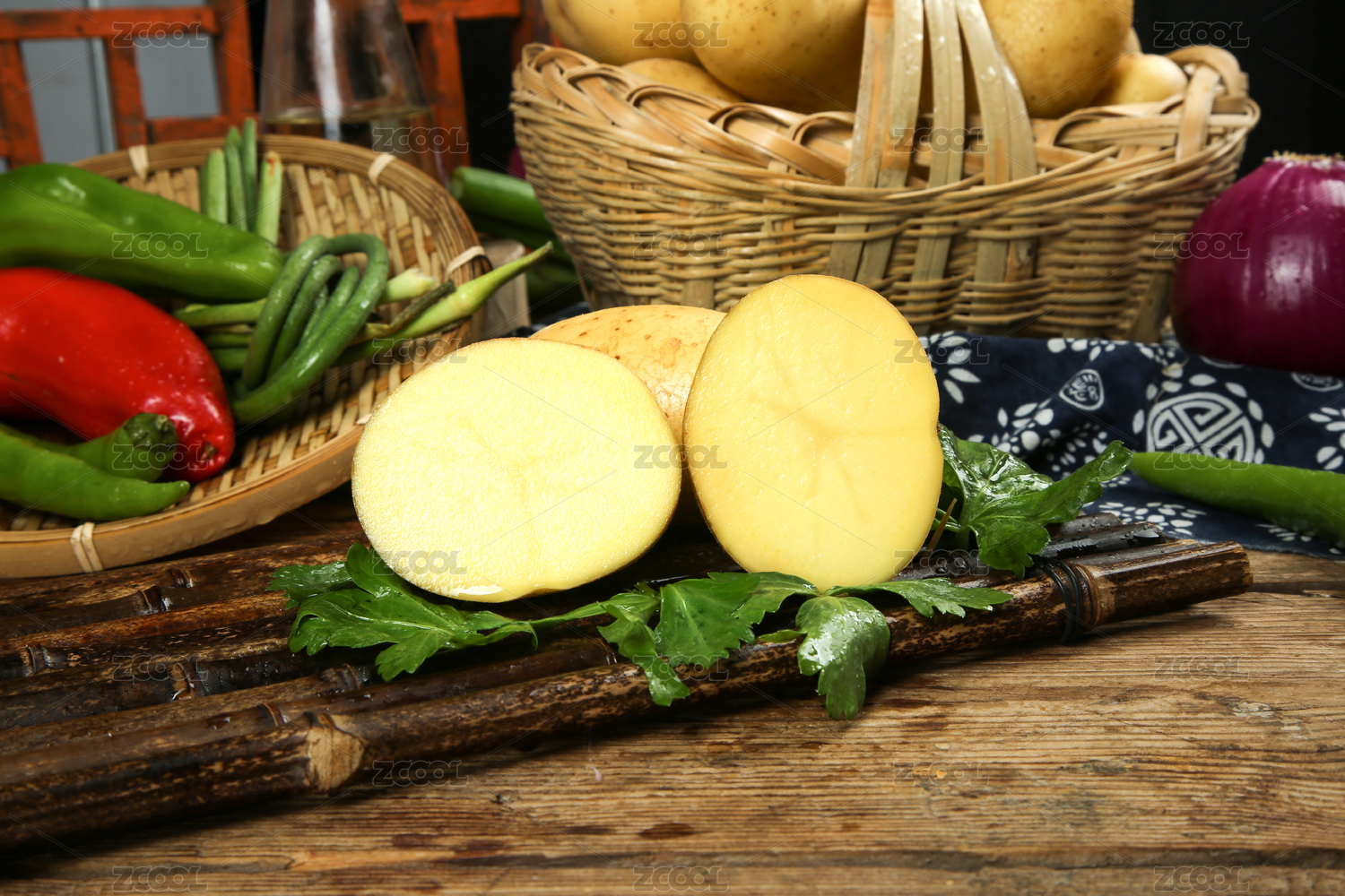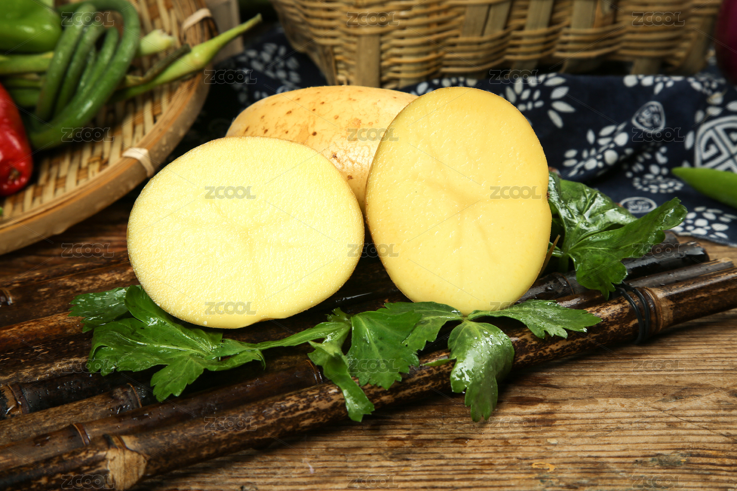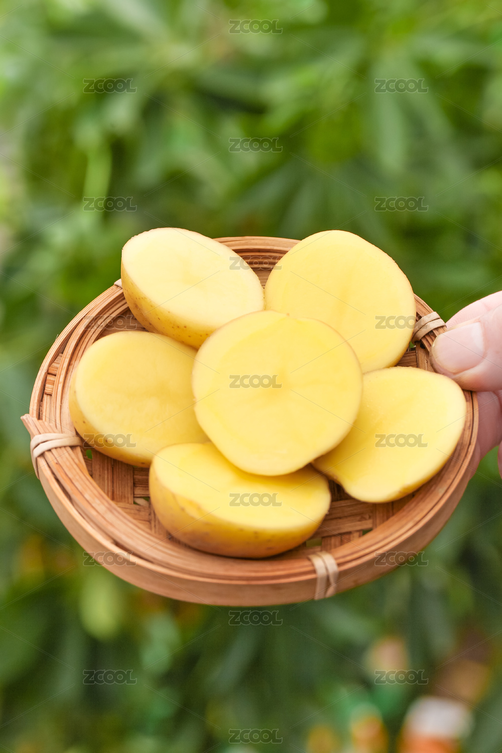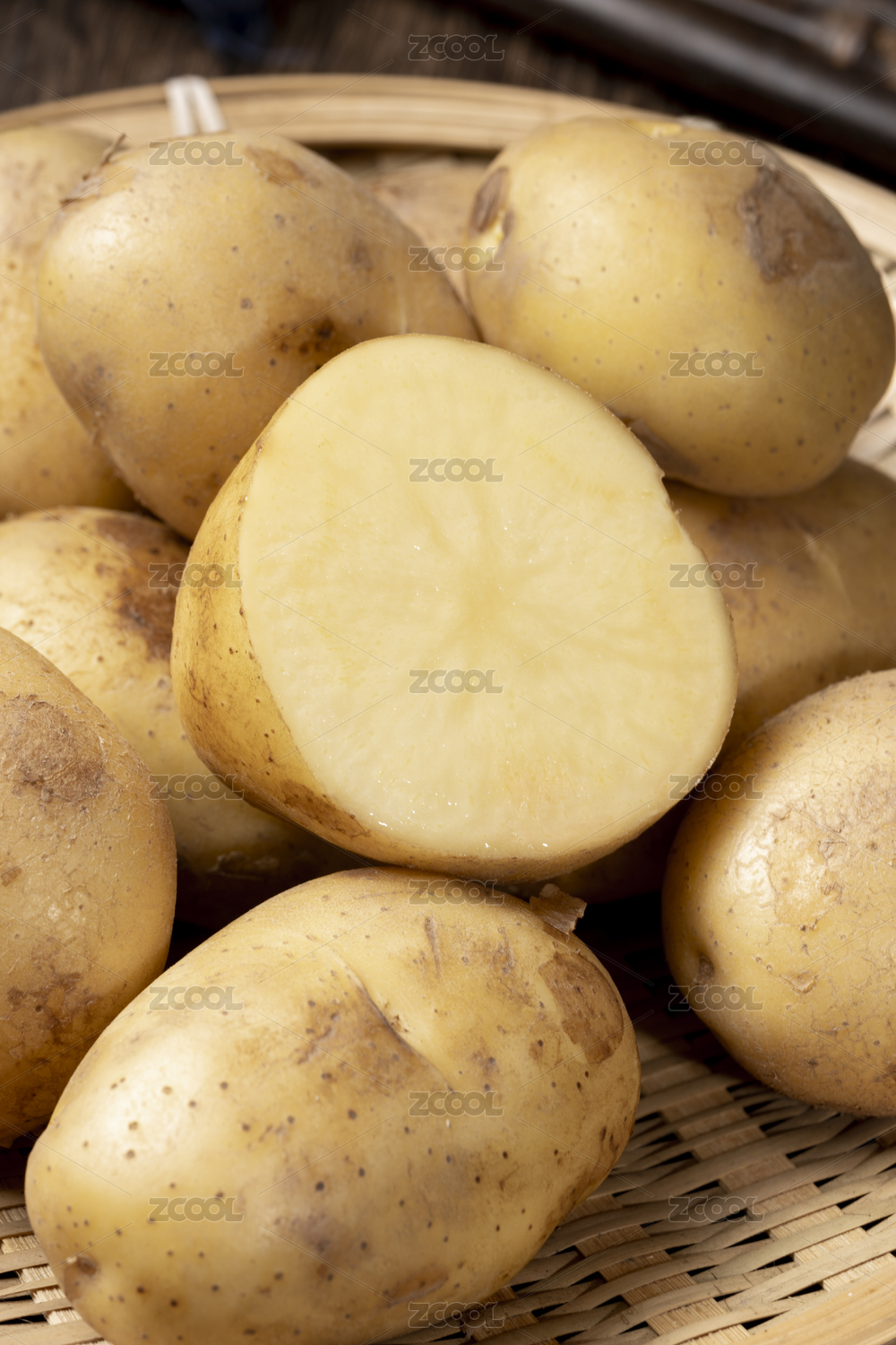 竹底上放著一個(gè)完整的土豆和切面的黃心土豆