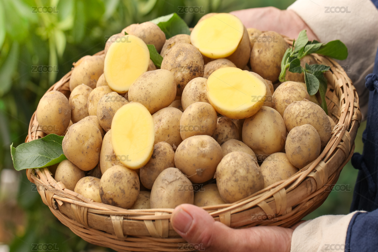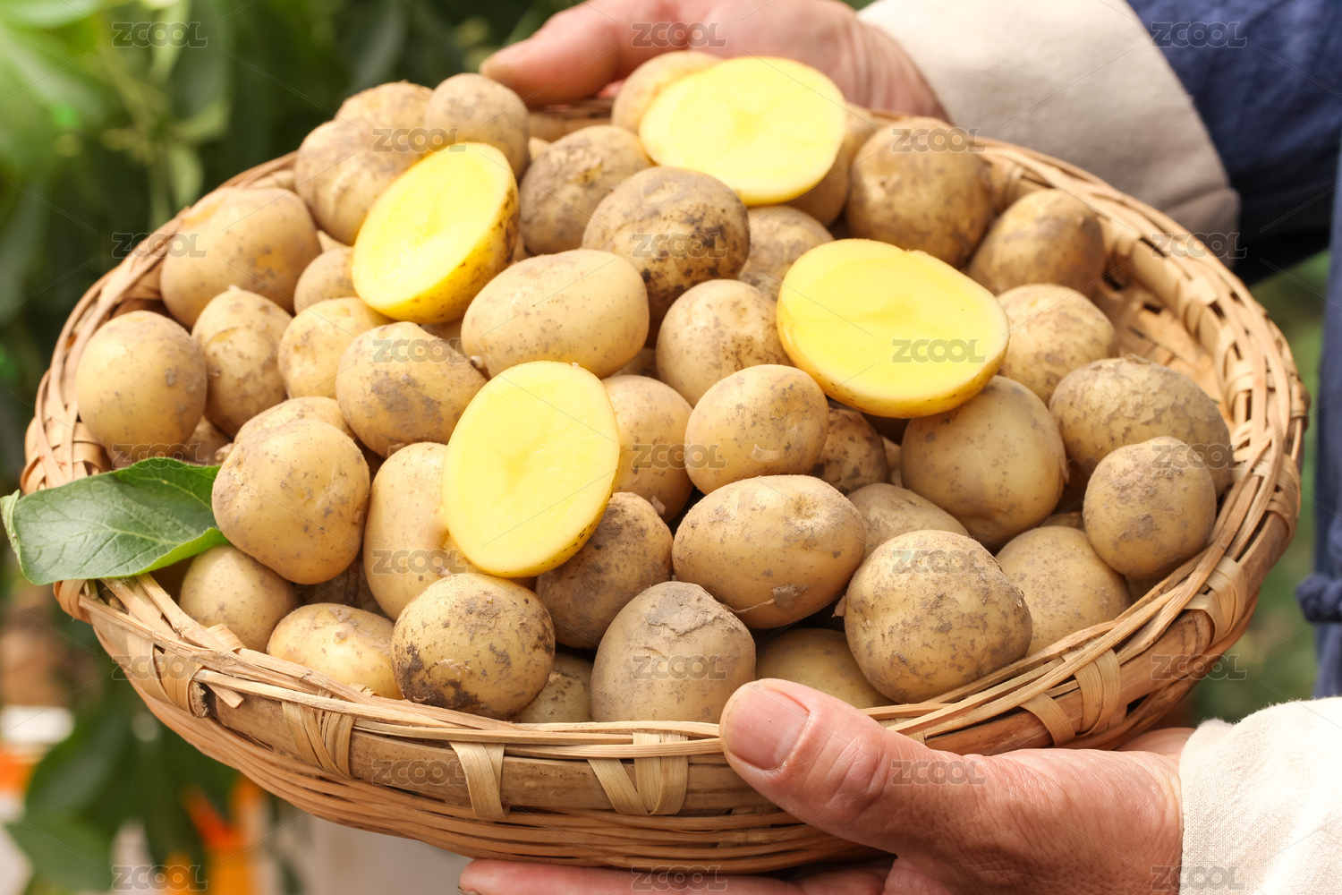 手上端著一藍(lán)小土豆和手上拿著半邊黃心土豆
