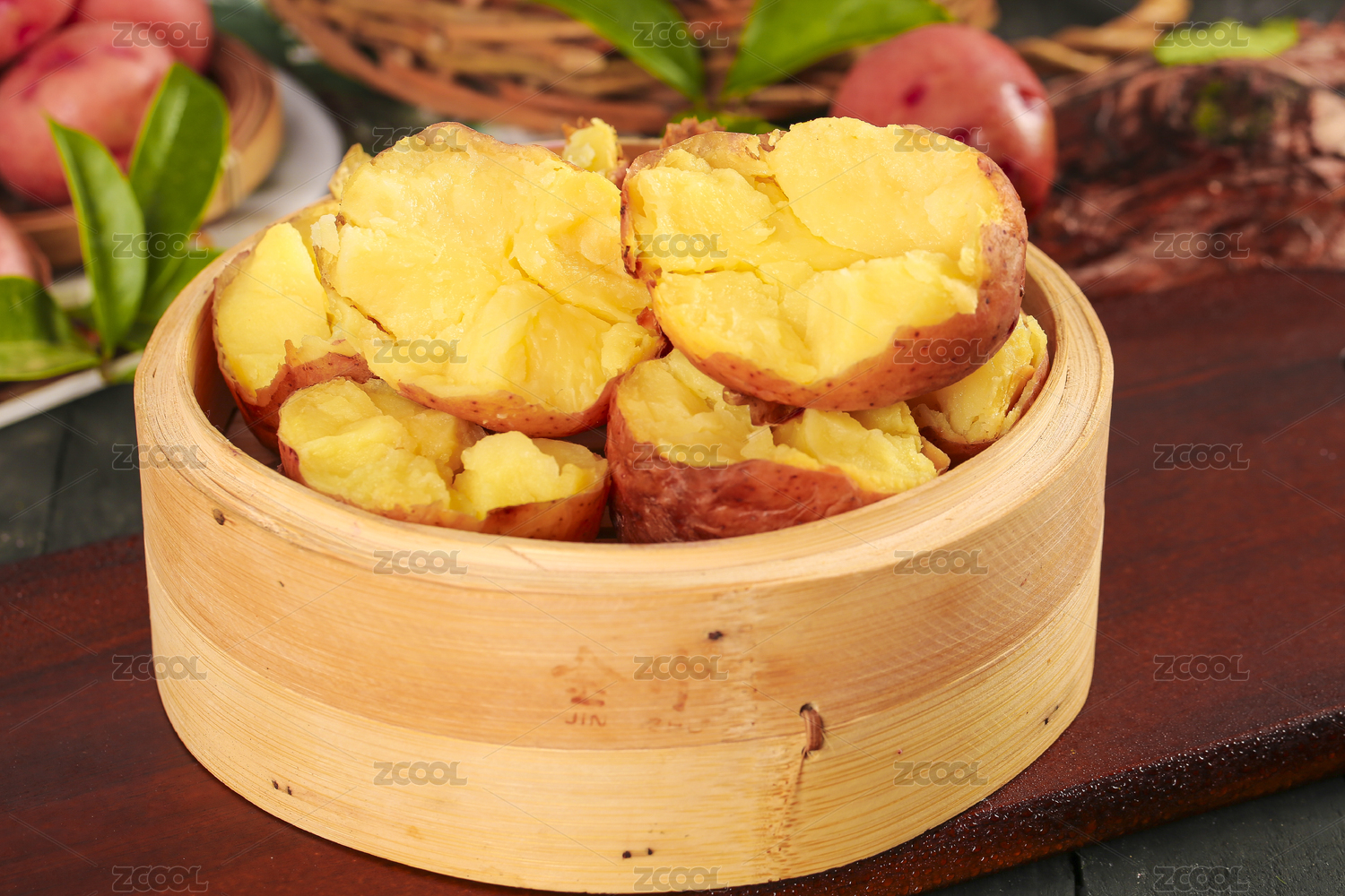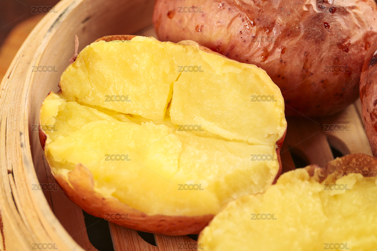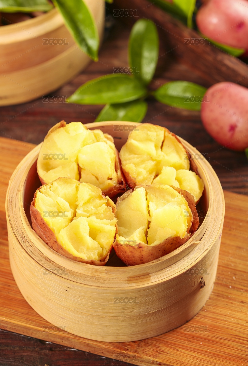 蒸籠上放著熟的紅皮黃心土豆