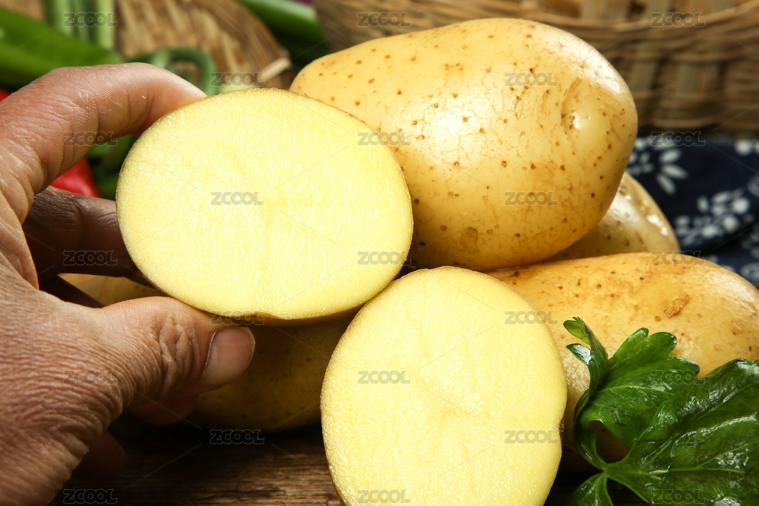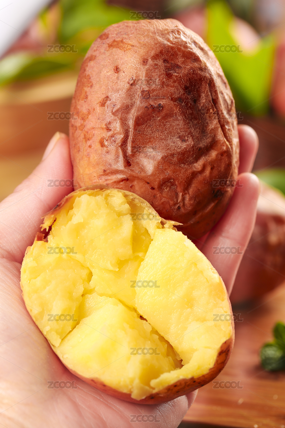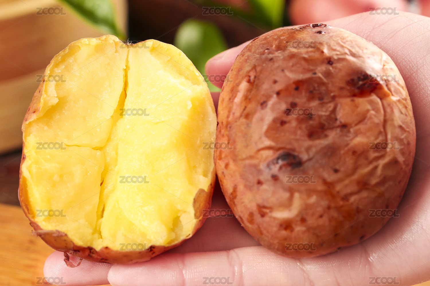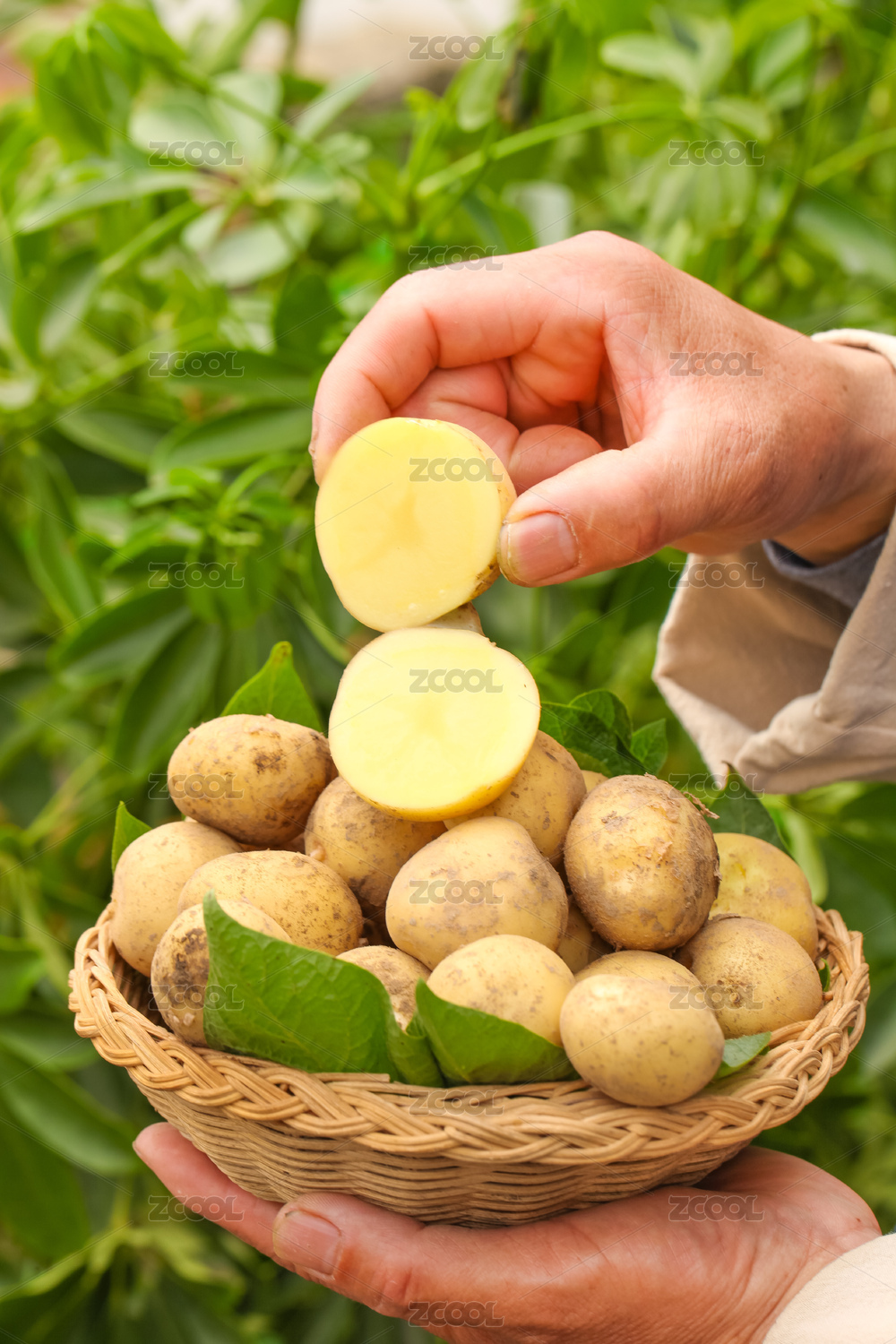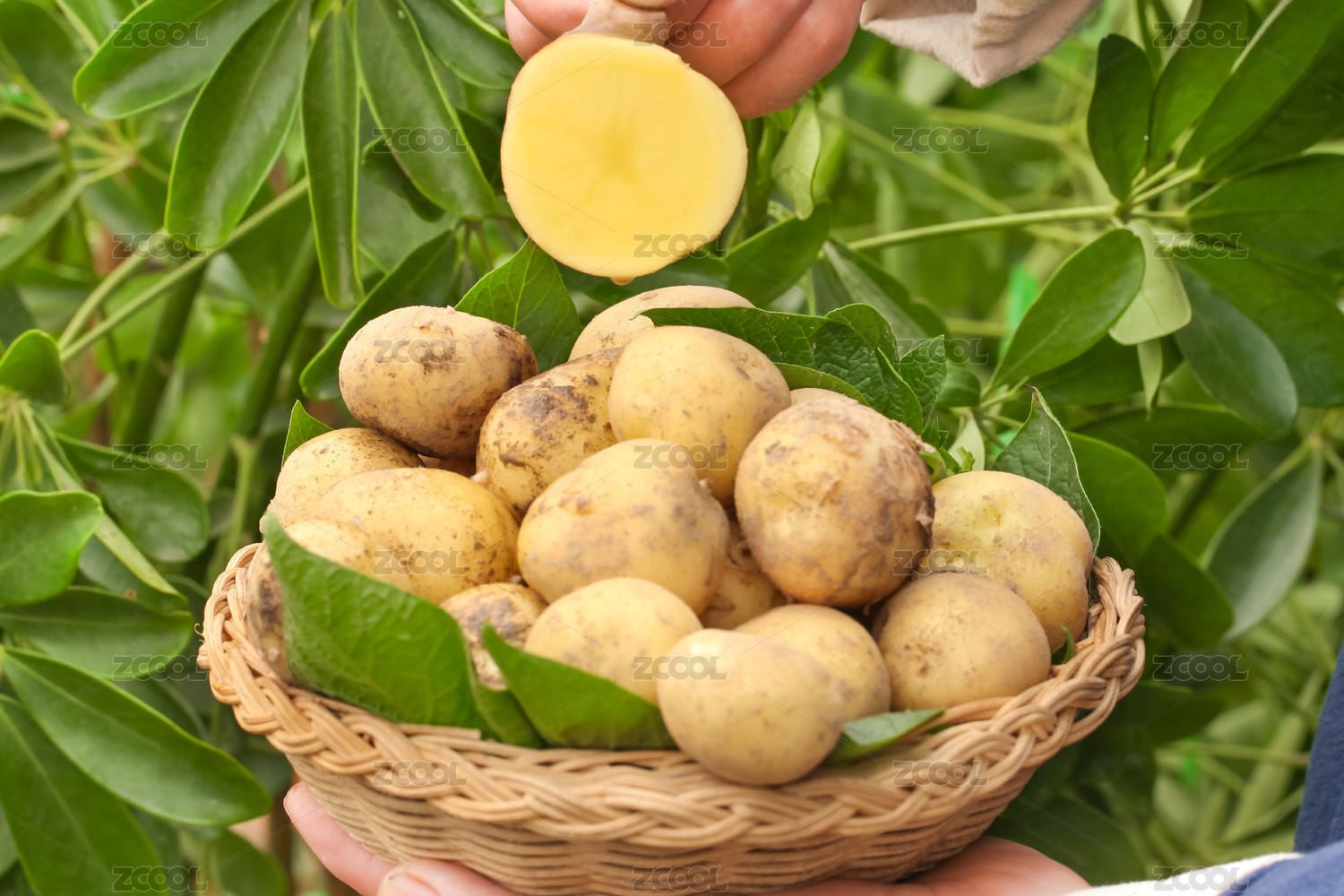 手上拿著一個(gè)完整的馬鈴薯和半邊黃心土豆