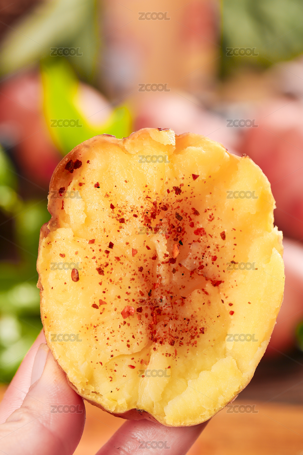 手上拿著半邊醮辣椒的黃心土豆