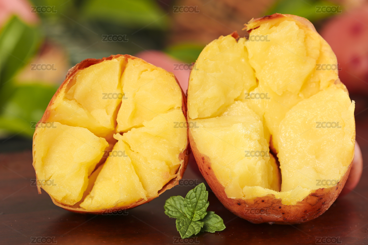 木底上放著兩塊半邊熟的黃心土豆