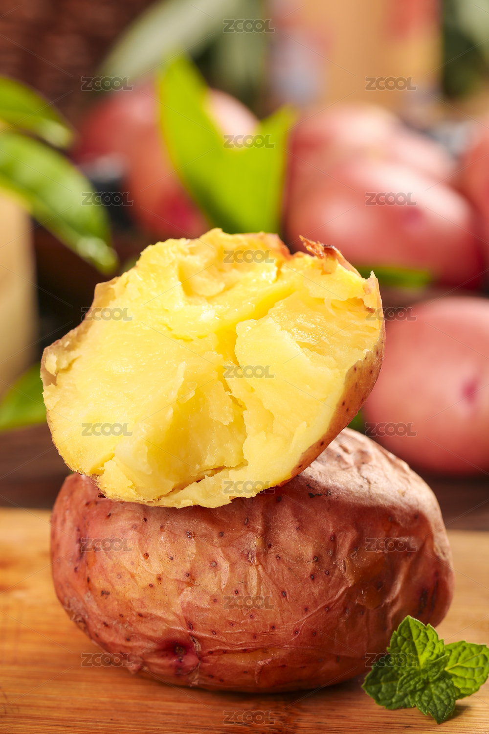 木底上放著一個(gè)完整的紅土豆和半邊黃心土豆