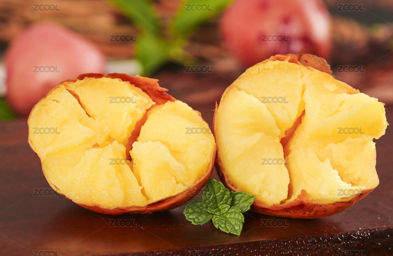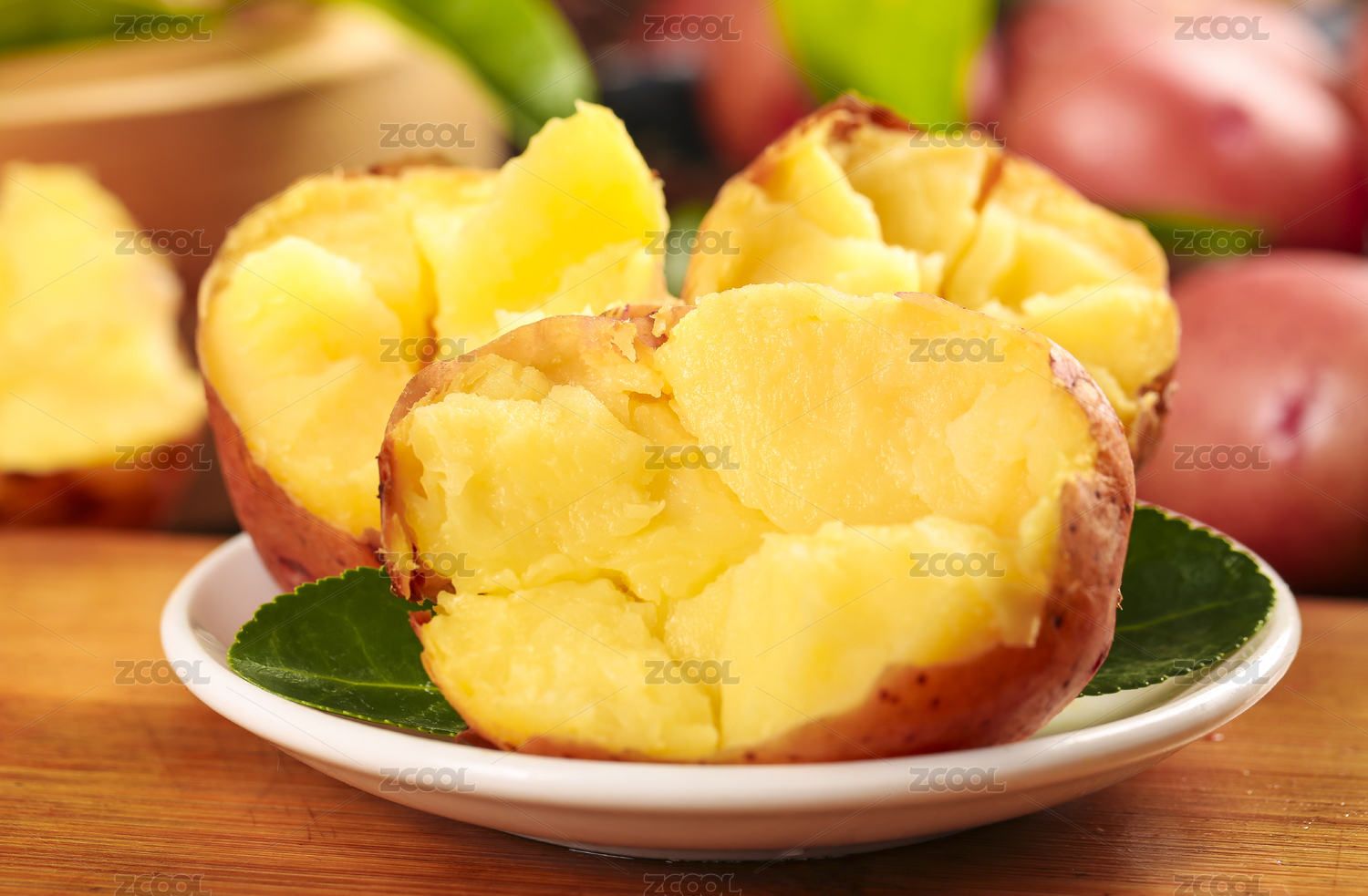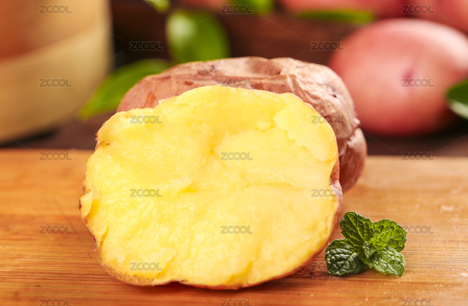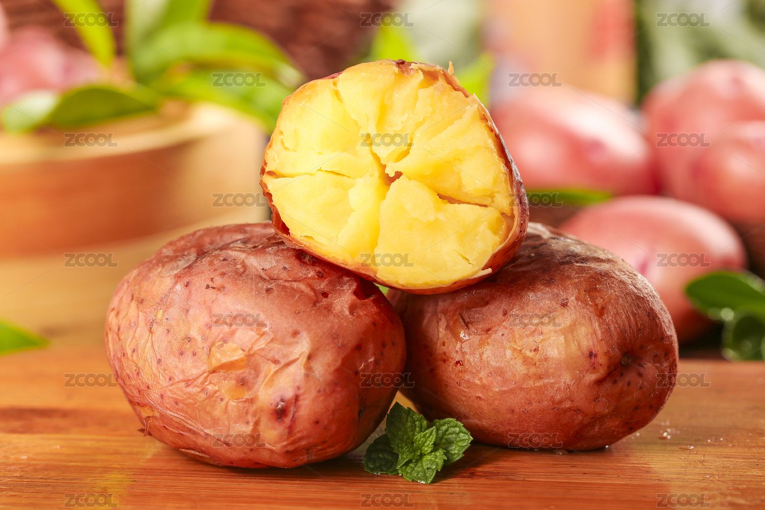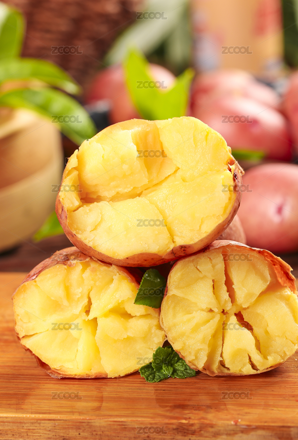 木底上放著兩個(gè)紅土豆和半邊熟的黃心土豆