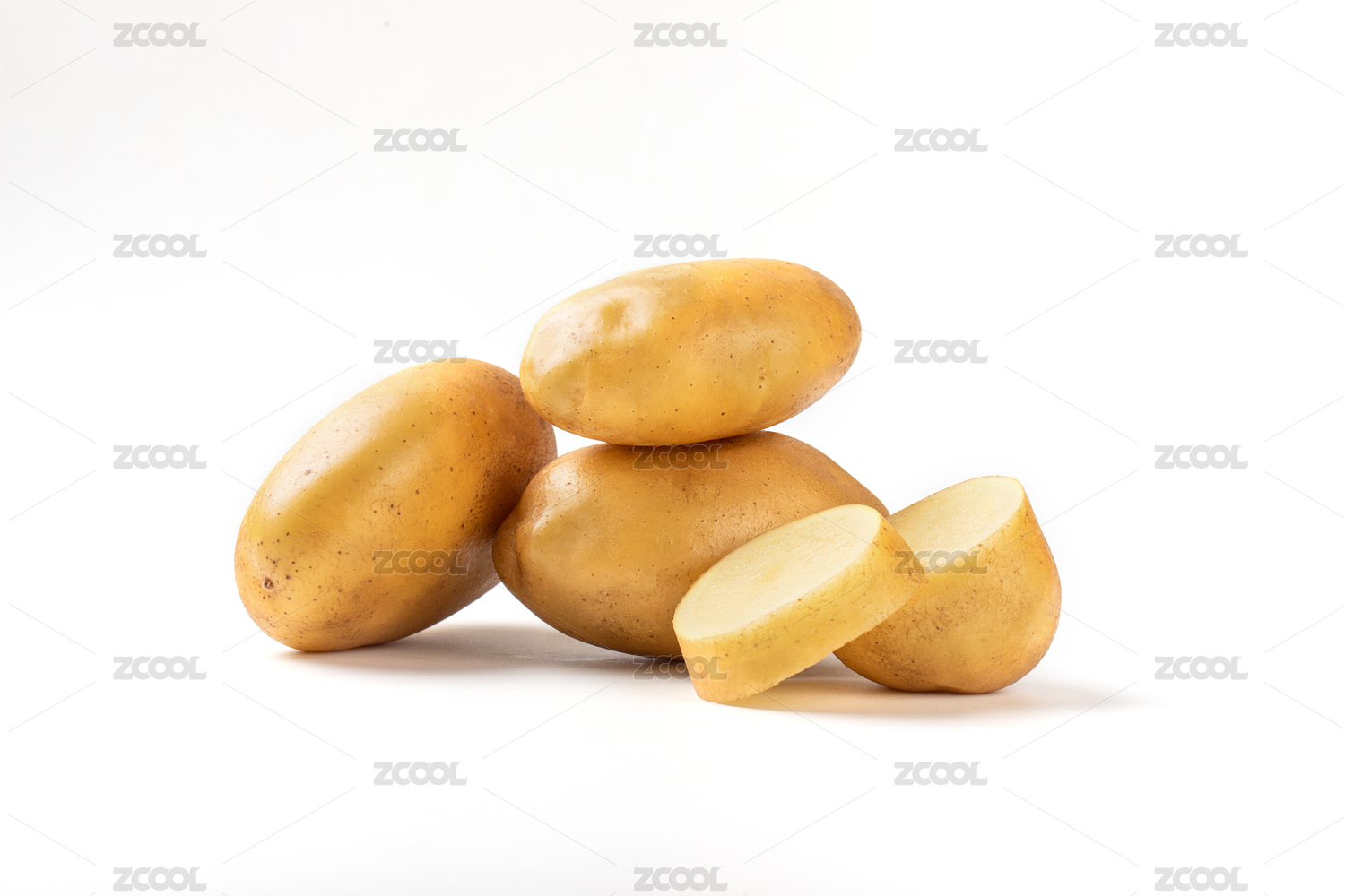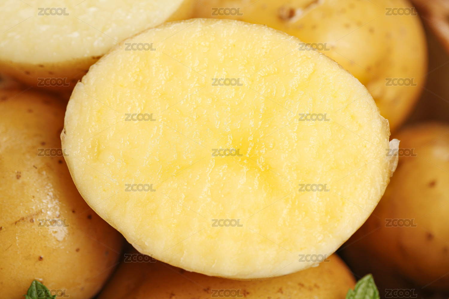一堆黃心土豆和一個(gè)切面的土豆特寫