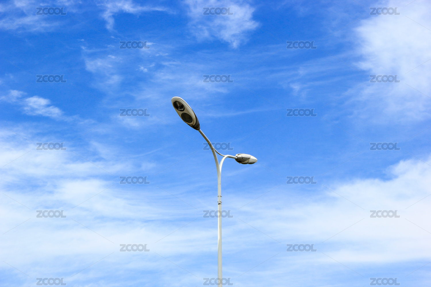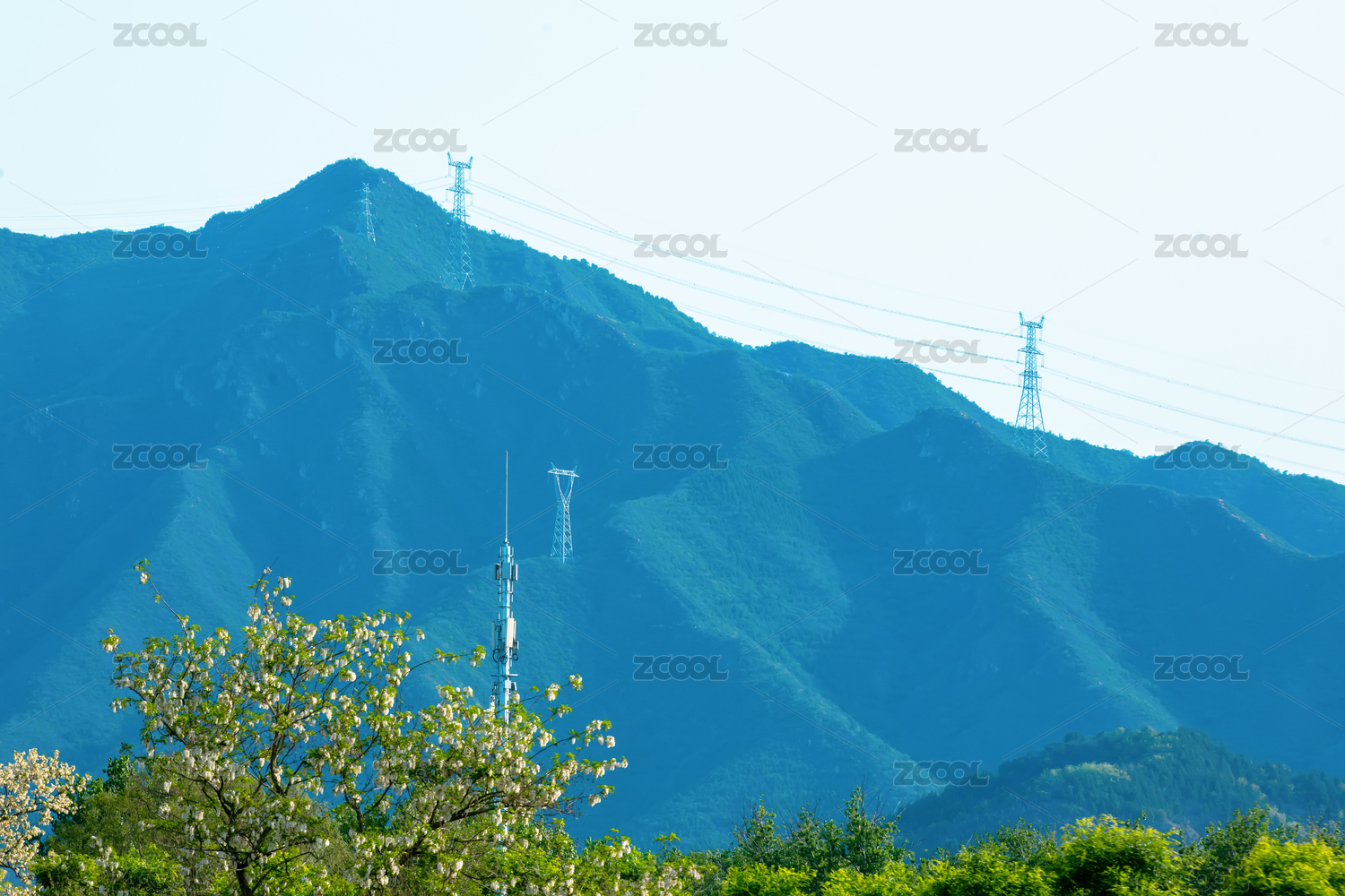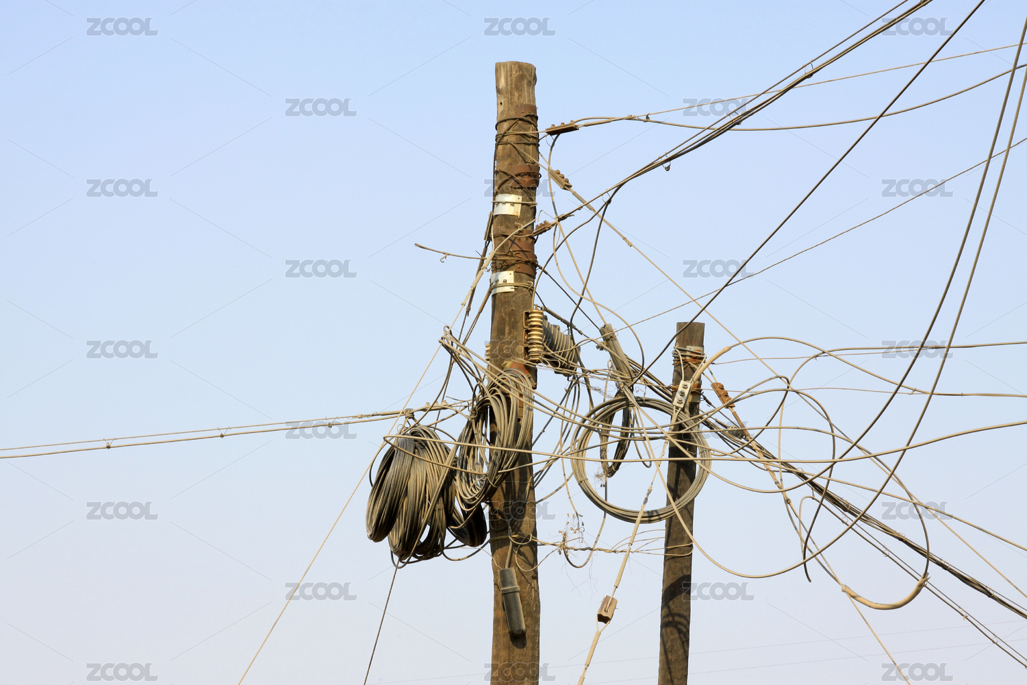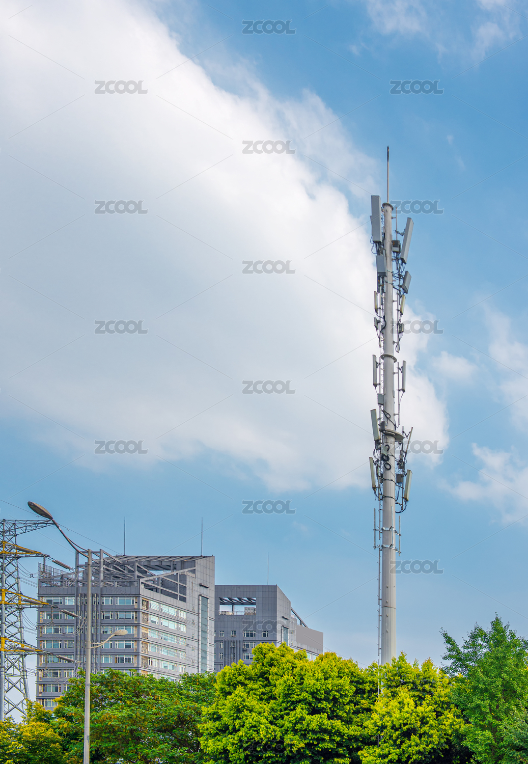 藍(lán)天白云背景下掛滿移動(dòng)通信蜂窩基站的電桿