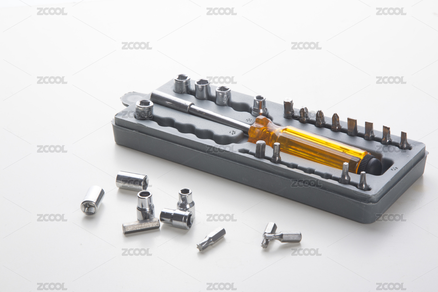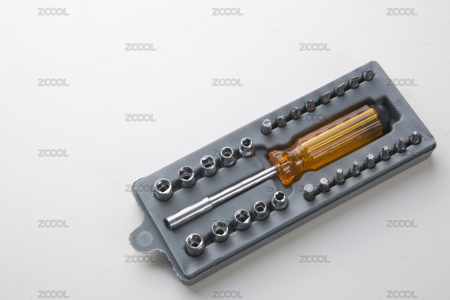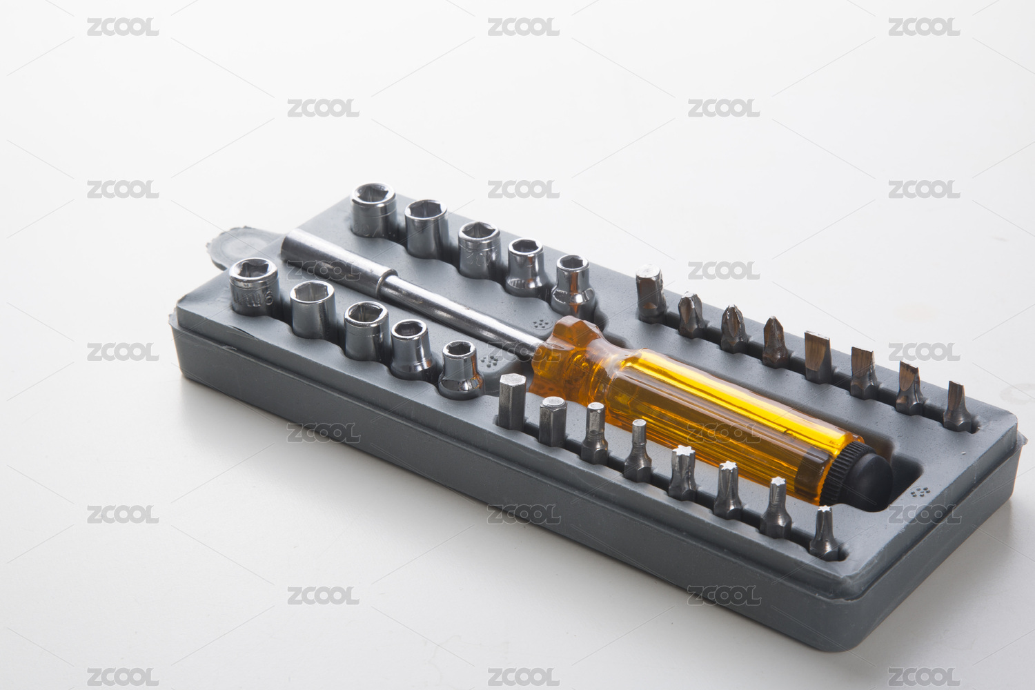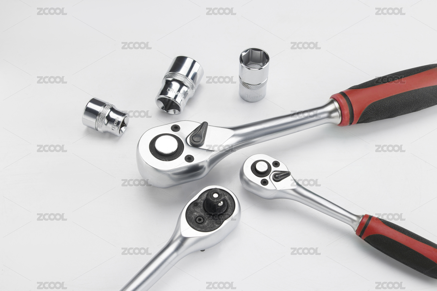 白色背景中的五金工具套筒和扭力扳手