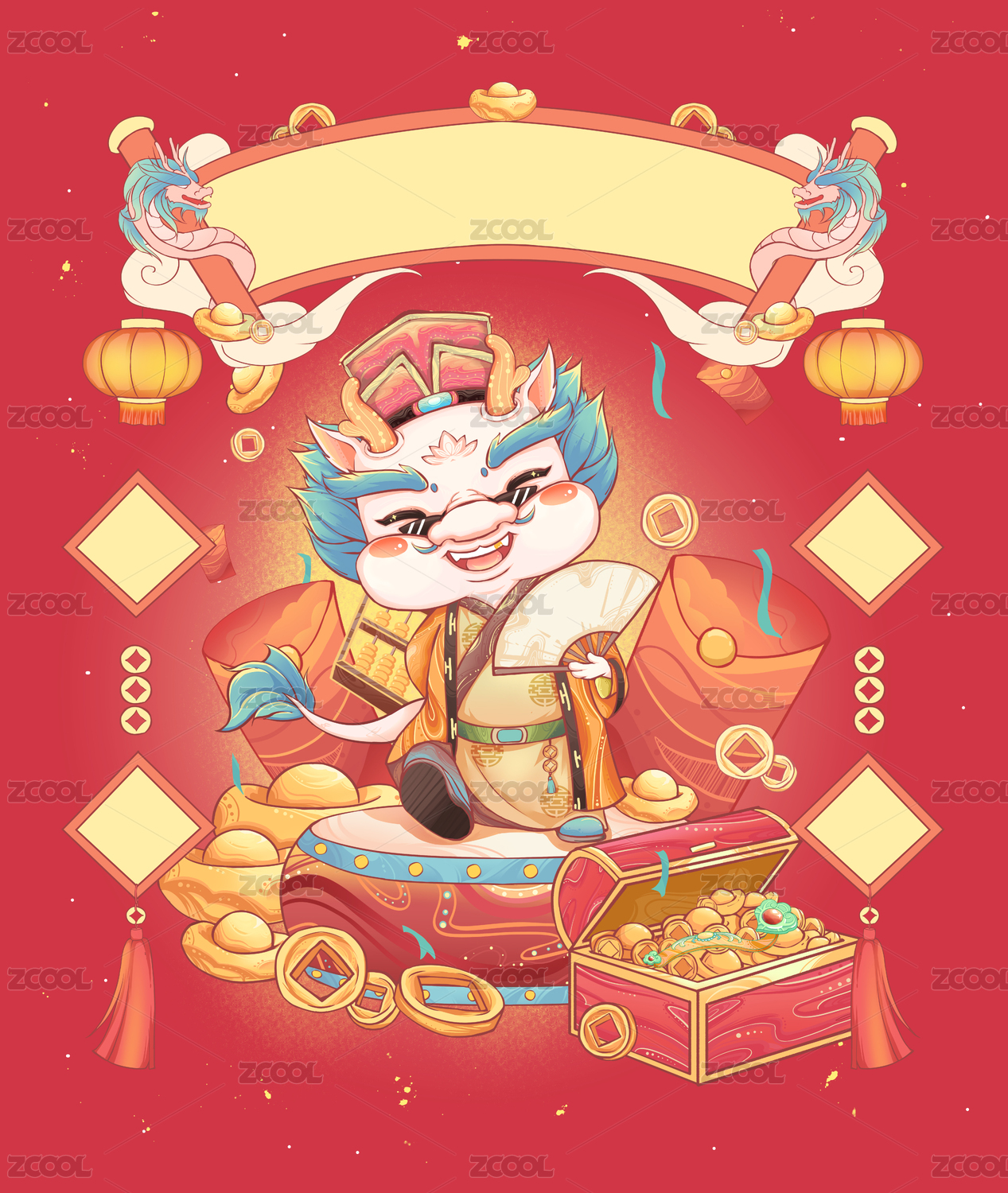 可愛龍年IP新春財神喜慶豎版海報國風插畫