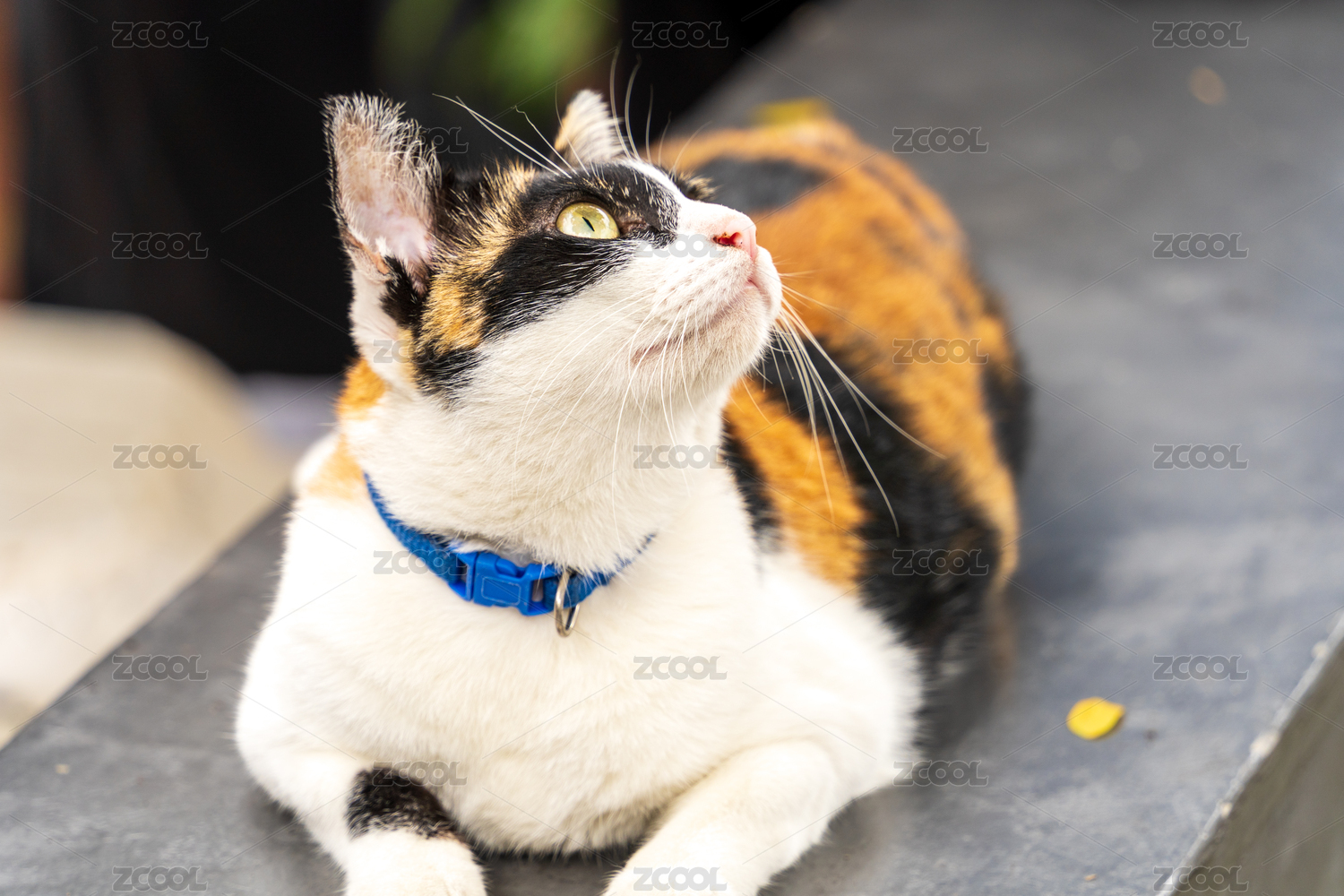 一只戴著藍(lán)色項(xiàng)圈的花貓