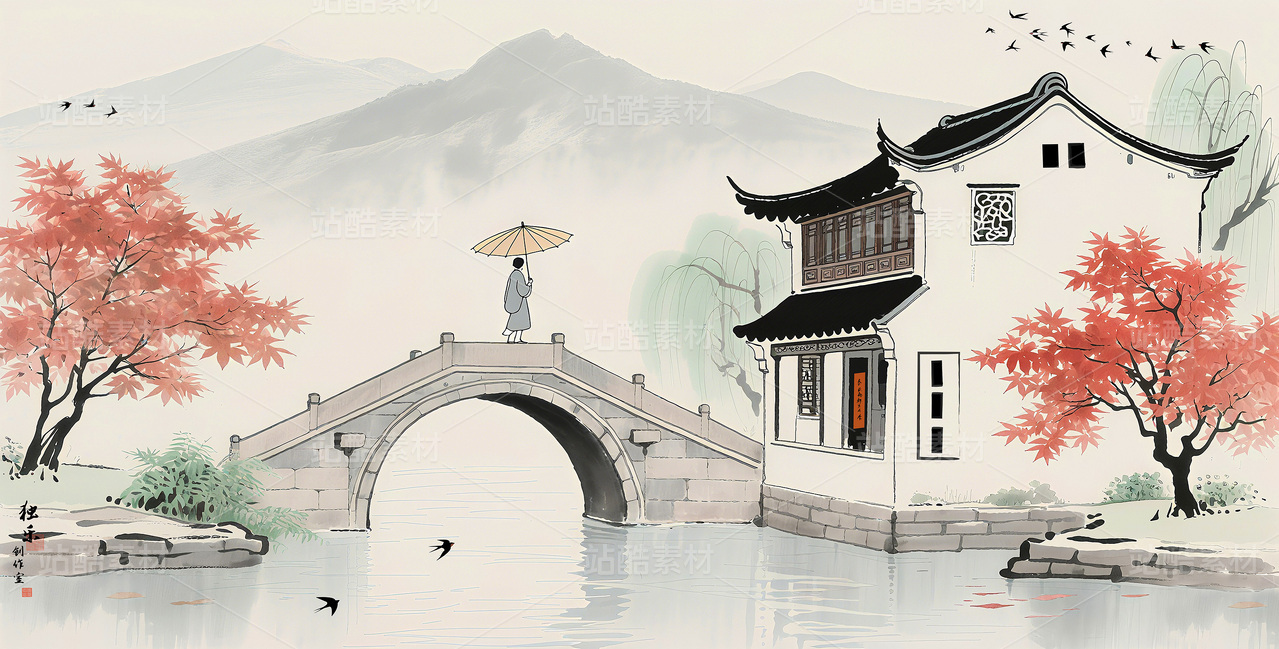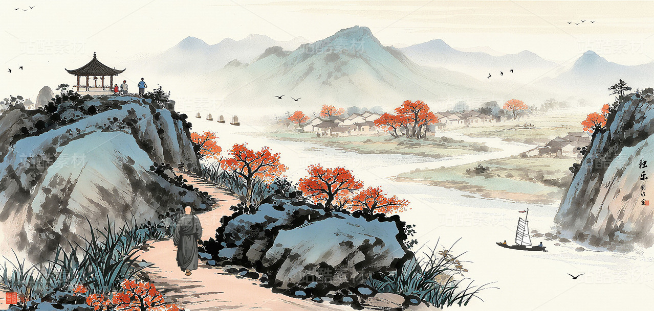 手繪油畫風(fēng)格中國(guó)風(fēng)水墨山水畫